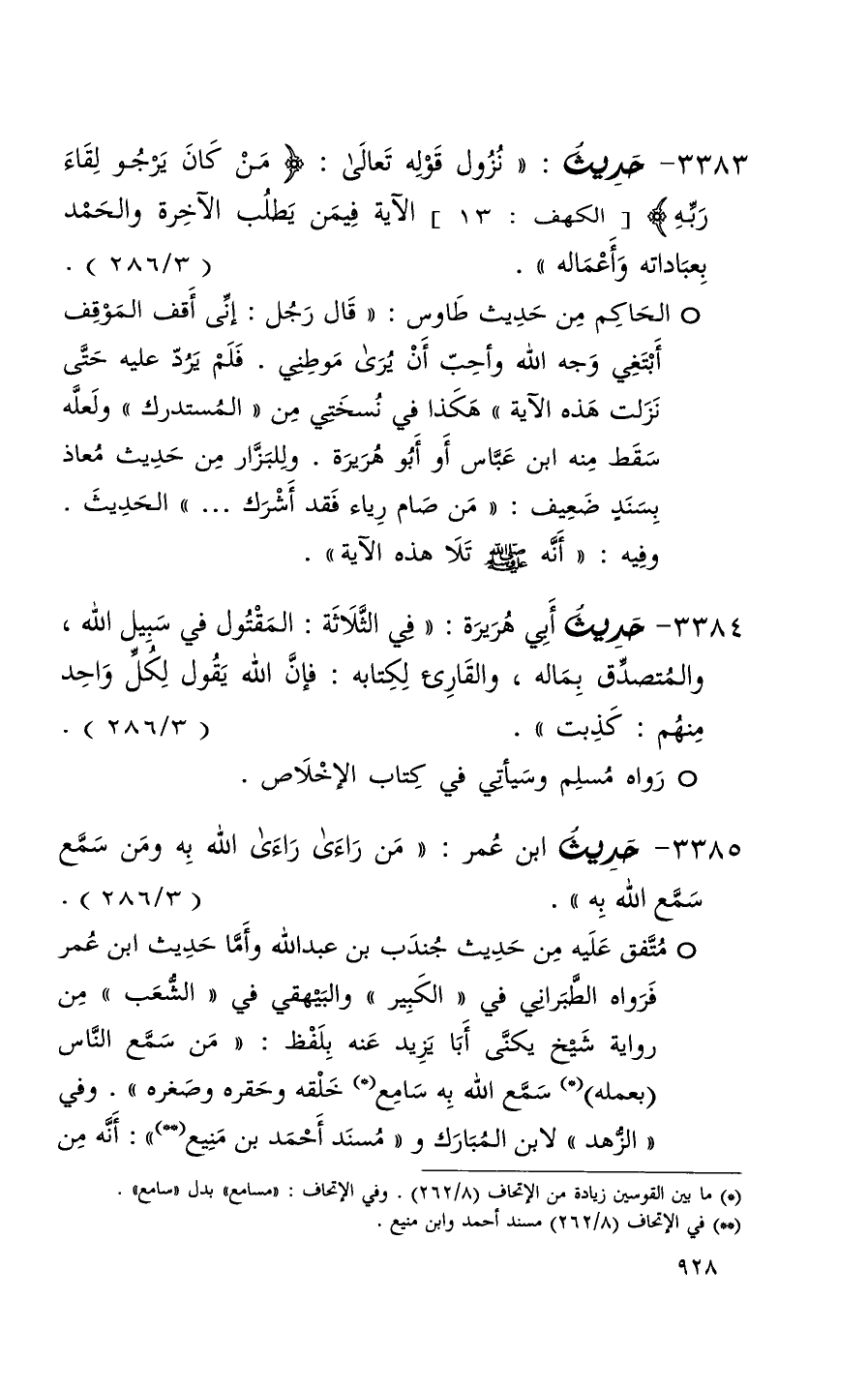 3383 حديث ( نزول قوله تعالى ( ^ من كان يرجو لقاء ربه ) الكهف 13 الآية فيمن يطلب الآخرة والحمد بعباداته وأعماله ) ( 3 / 286 ) (1)