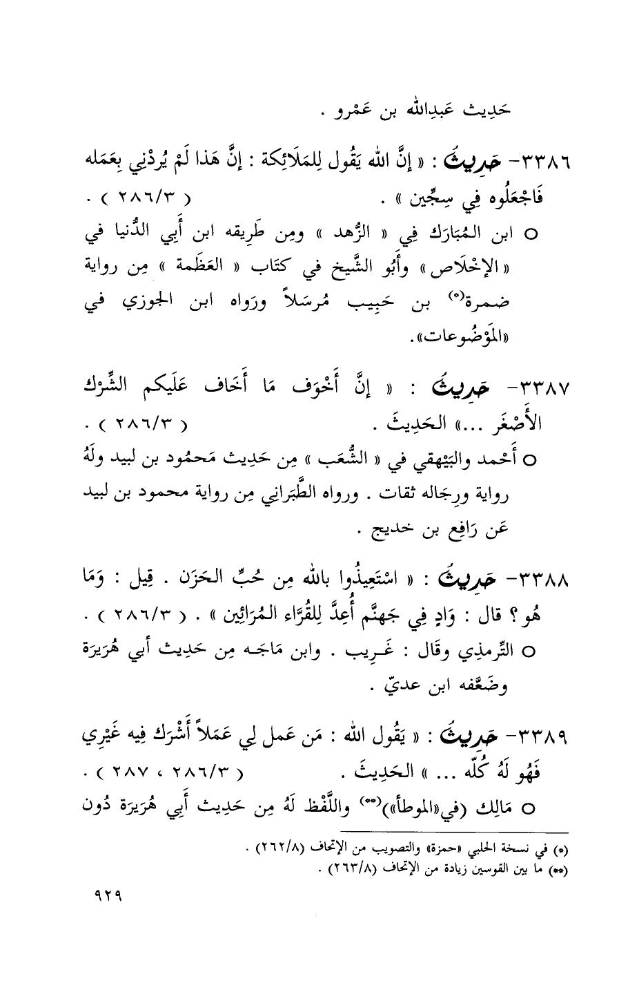 389 حديث ( يقول الله من عمل لي عملاً أشرك فيه غيري فهو له كله 000 ) الحديث ( 3 / 286ِ 287 ) + مالك في الموطأ واللفظ له من حديث أبي هريرة دون