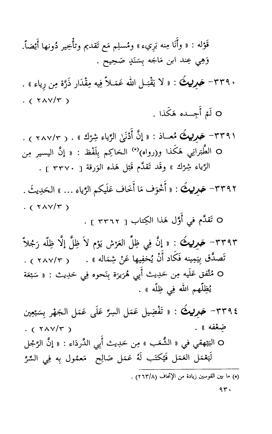 3390 حديث ( لا يقبل الله عملاً فيه مقدار ذرة من رياء ) ( 3 / 287 )