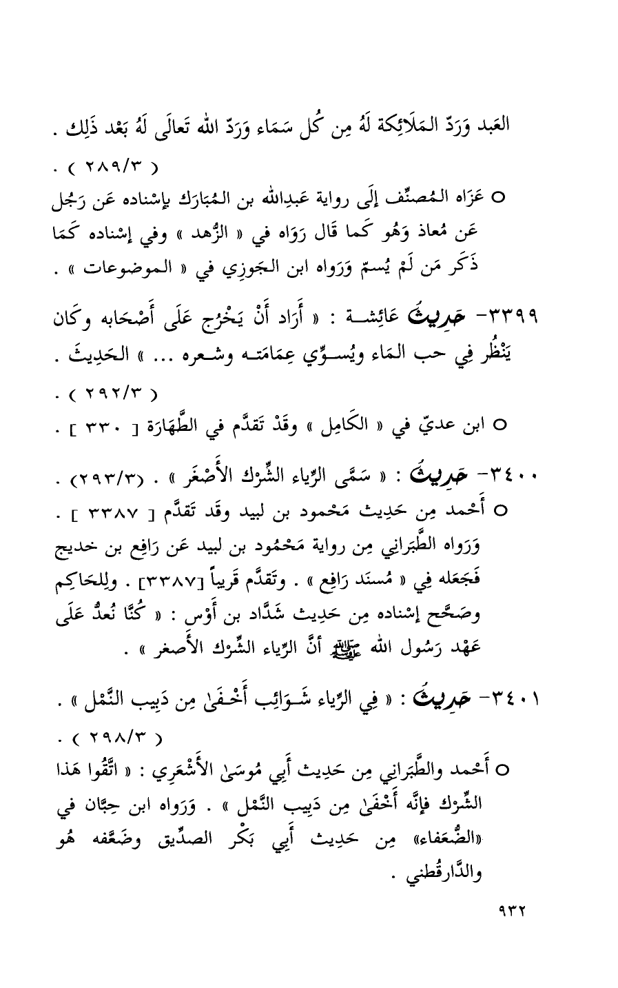 3401 حديث ( في الرياء شوائب أخفى من دبيب ا لنمل ) ( 3 / 298 ) + أحمد والطبراني من حديث أبي موسى الأشعري ( اتقوا هذا الشرك فإنه أخفى من دبيب النمل ) ورواه ابن جبان في الضعفاء من حديث أبي بكر الصديق وضعفه هو والدارقطني +