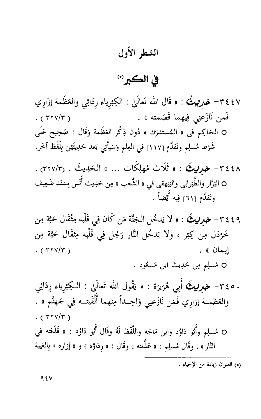 3447 حديث ( قال الله تعالى ( الكبرياء ردائي والعظمة إزاري فمن نازعني فيهما قصمته ) ( 3 / 327 ) (1)