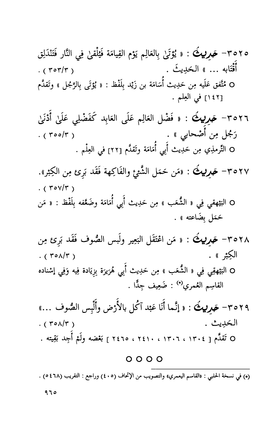 3525 حديث ( يؤتى بالعالم يوم القيامة فيلقى في النار فتندلق أقتابه . . . ) الحديث ( 3 / 353 ) (1)