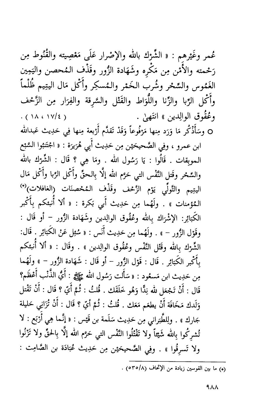 1- وسأذكر ما ورد منها مرفوعاً وقد تقدم أربعة منها في حديث عبد الله ابن عمرو وفي الصحيحين من حديث أبي هريرة ( اجتنبوا السبع الموبقات قالوا يا رسول الله وما هي قال الشرك بالله والسحر وقتل النفس التي حرم الله إلا بالحق وأكل الربا وأكل مال اليتيم والتولي يوم الزحف وقذف المحصنات الغافلات المؤمنات ) ولهما من حديث أبي بكرة ( ألا أنبئكم بأكبر الكبائر الإشراك بالله وعقوق الوالدين وشهادة الزور أو قال وقول الزور ) ولهما من حديث أنس ( سئل عن الكبائر قال : الشرك بالله وقتل النفس وعقوق الوالدين ' . وقال : ' ألا أنبئكم بأكبر الكبائر قال قول الزور أو قال شهادة الزور ) ولهما من حديث ابن مسعود ( سألت رسول الله أي الذنب أعظم قال أن تجعل لله نداً وهو خلقك قلت ثم أي قال أن تقتل ولدك مخافة أن يطعم معك قلت ثم أي قال أن تزاني حليلة جارك وللطبراني من حديث سلمة بن قيس ( إنما هي أربع لا تشركوا بالله شيئاً ولا تقتلوا النفس التي حرم الله إلا بالحق ولا تزنوا ولا تسرفوا ) وفي الصحيحين من حديث عبادة بن الصام