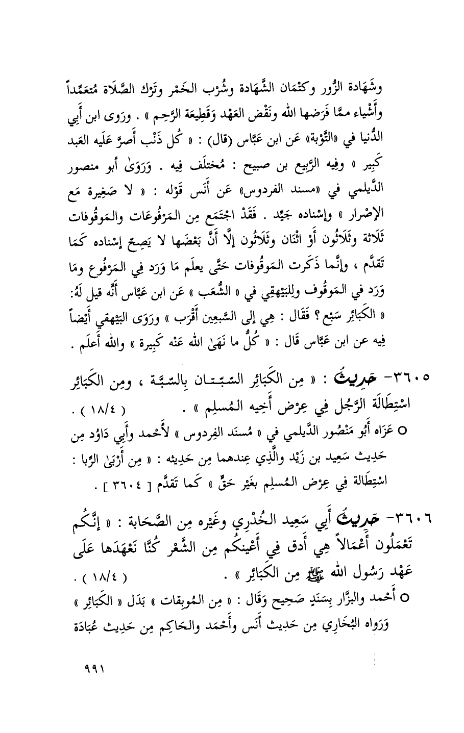 وشهادة الزور وكتمان الشهادة وشرب الخمر وترك الصلاة متعمداً وأشياء مما فرضها الله ونقض العهد وقطيعة الرحم ) وروى ابن أبي الدنيا في التوبة عن ابن عباس قال ( كل ذنب أصر عليه العبد كبير ) وفيه الربيع بن صبيح مختلف فيه وروى أبو منصور الديلمي في مسند الفردوس عن أنس قوله ( لا صغيرة مع الإصرار ) وإسناده جيد فقد اجتمع مع المرفوعات والموقوفات ثلاثة وثلاثون أو اثنان وثلاثون إلا أن بعضها لا يصح إسناده كما تقدم وإنما ذكرت الموقوفات حتى يعلم ما ورد في المرفوع وما ورد في الموقوف وللبيهقي في الشعب عن ابن عباس أنه قيل له ( الكبائر سبع فقال هي إلى السبعين أقرب ) وروى البيهقي أيضاً فيه عن ابن عباس قال ( كل ما نهى الله عنه كبيرة ) والله أعلم (1) عزاه أبو منصور الديلمي في مسند الفردوس لأحمد وأبي داود من حديث سعيد بن زيد والذي عندهما من حديثه ( من أربى الربا استطالة في عرض المسلم بغير حق ) كما تقدم 3604 +