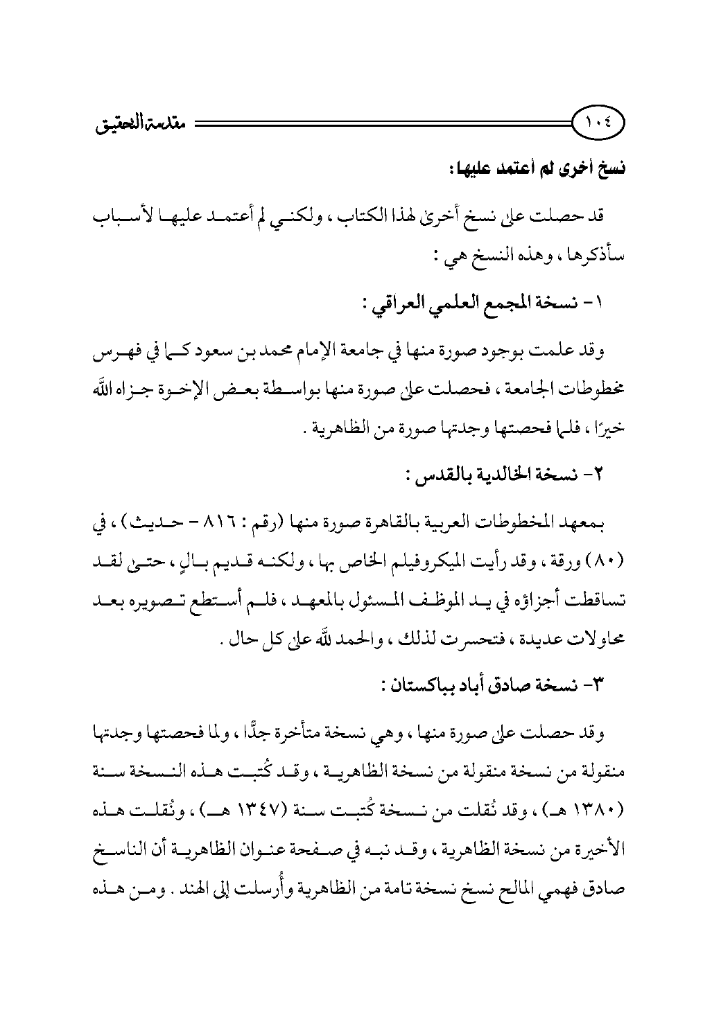 وقد علمت بوجود صورة منها في جامعة الإمام محمد بن سعود كما في فهرس مخطوطات الجامعة، فحصلت على صورة منها بواسطة بعض الإخوة جزاه الله خيرًا، فلما فحصتها وجدتها صورة من الظاهرية.