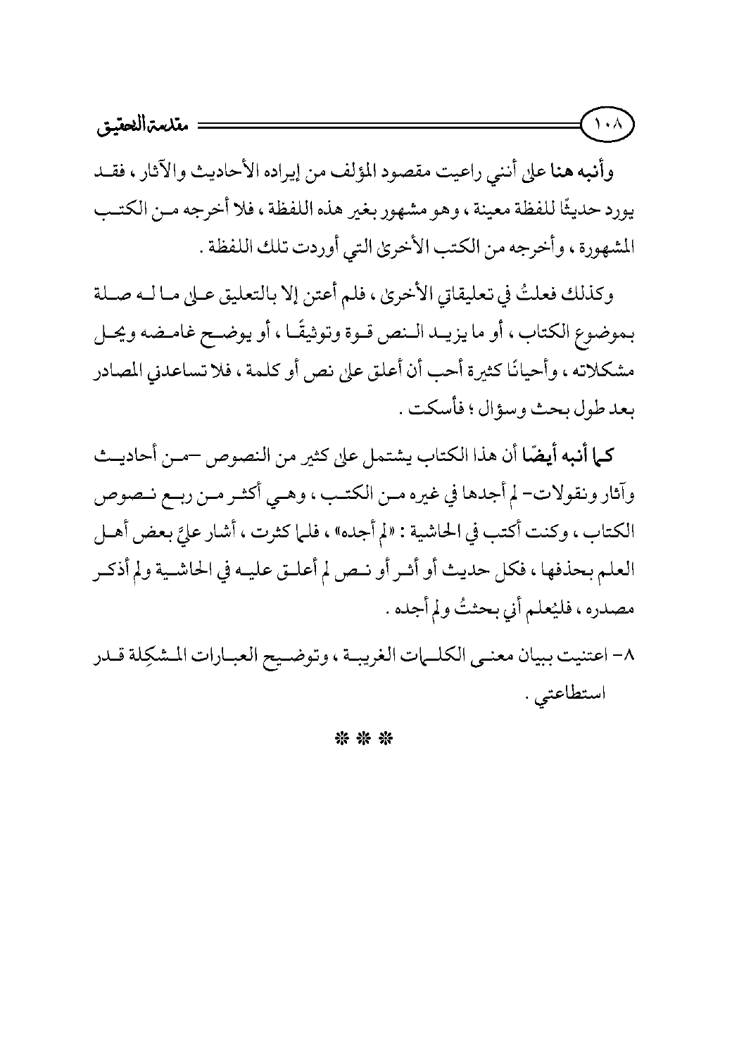 وكذلك فعلتُ في تعليقاتي الأخرى، فلم أعتن إلا بالتعليق على ما له صلة بموضوع الكتاب، أو ما يزيد النص قوة وتوثيقًا، أو يوضح غامضه ويحل مشكلاته، وأحيانًا كثيرة أحب أن أعلق على نص أو كلمة، فلا تساعدني المصادر بعد طول بحث وسؤال؛ فأسكت.