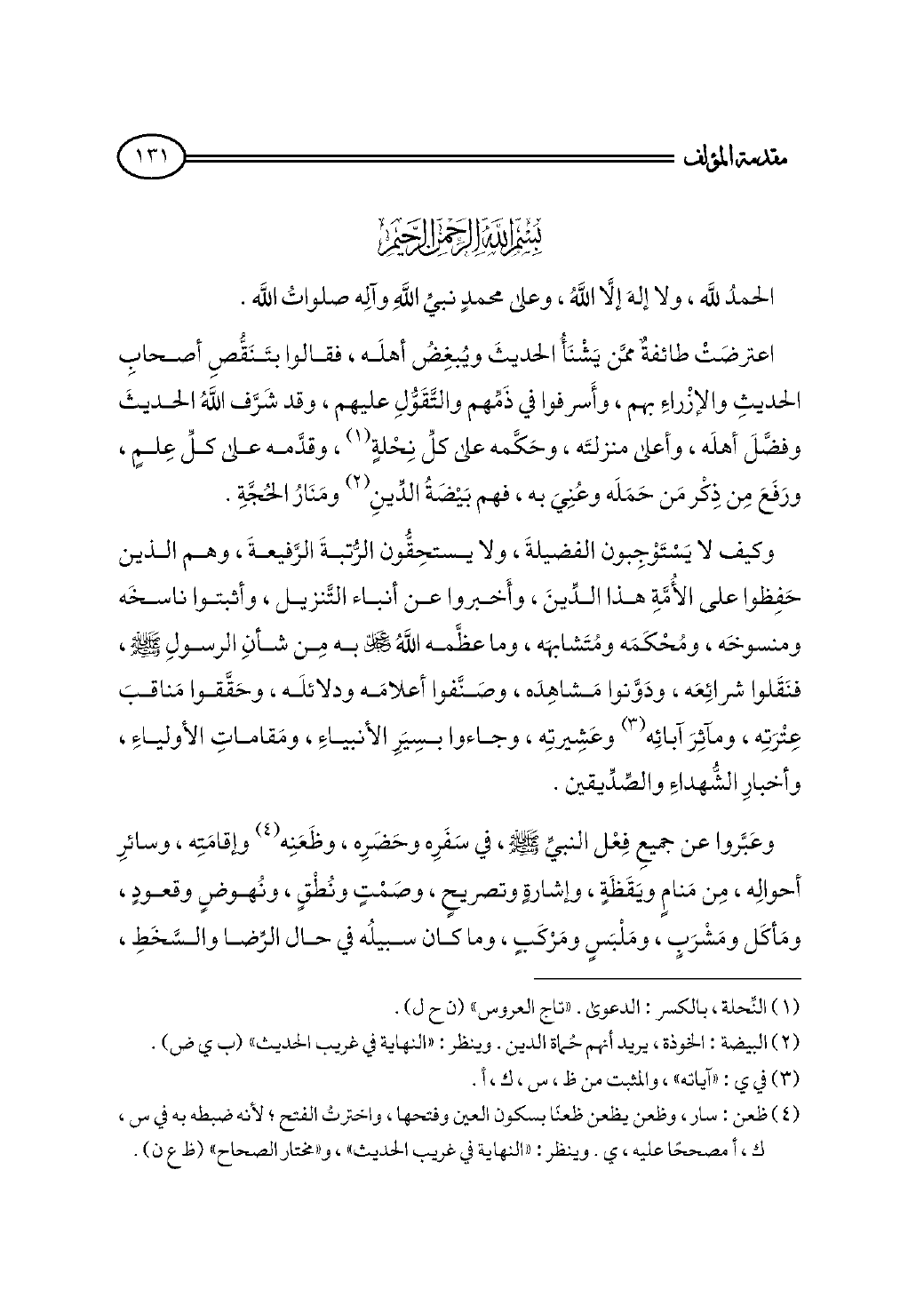 اعترضَتْ طائفةٌ ممَّن يَشْنَأُ الحديثَ ويُبغِضُ أهلَه، فقالوا بتَنَقُّصِ أصحابِ الحديثِ والإزْراءِ بهم، وأَسرفوا في ذَمِّهم والتَّقَوُّلِ عليهم، وقد شَرَّف اللهُ الحديثَ وفضَّلَ أهلَه، وأعلى منزلتَه، وحَكَّمه على كلِّ نِحْلةٍ (¬١)، وقدَّمه على كلِّ عِلمٍ، ورَفَعَ مِن ذِكْر مَن حَمَلَه وعُنِيَ به، فهم بَيْضَةُ الدِّينِ (¬٢) ومَنَارُ الحُجَّةِ.