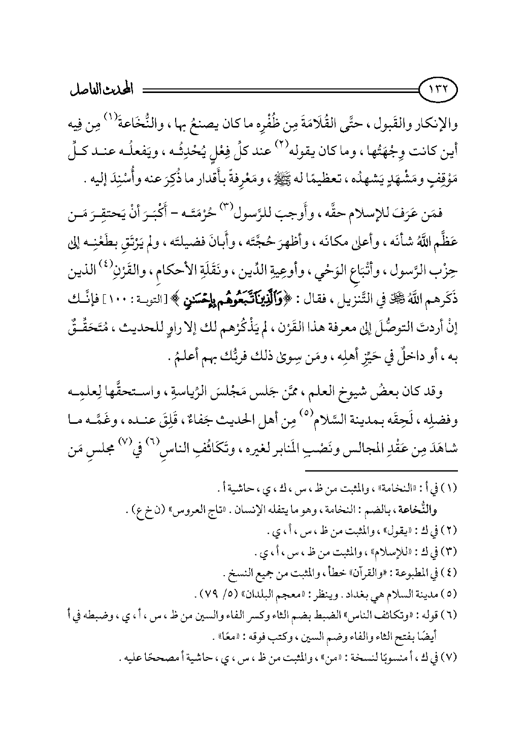 فمَن عَرَفَ للإسلام حقَّه، وأَوجبَ للرَّسول (¬٣) حُرْمَتَه - أَكْبَرَ أنْ يَحتقِرَ مَن عَظَّم اللهُ شأنَه، وأعلى مكانَه، وأظهرَ حُجَّتَه، وأَبانَ فضيلتَه، ولم يَرْتَقِ بطَعْنِه إلى حِزْب الرَّسول، وأتْبَاعِ الوَحْي، وأوعِيةِ الدِّين، ونَقَلَةِ الأحكامِ، والقَرْنِ (¬٤) الذين ذَكَرهم اللهُ - عز وجل - في التَّنزيل، فقال: {وَالَّذِينَ اتَّبَعُوهُمْ بِإِحْسَانٍ} [التوبة: ١٠٠] فإنَّك إنْ أردتَ التوصُّلَ إلى معرفة هذا القَرْن، لم يَذْكُرْهم لك إلا راوٍ للحديث، مُتَحَقِّقٌ به، أو داخلٌ في حَيِّزِ أهلِه، ومَن سِوى ذلك فربُّك بهم أعلمُ.