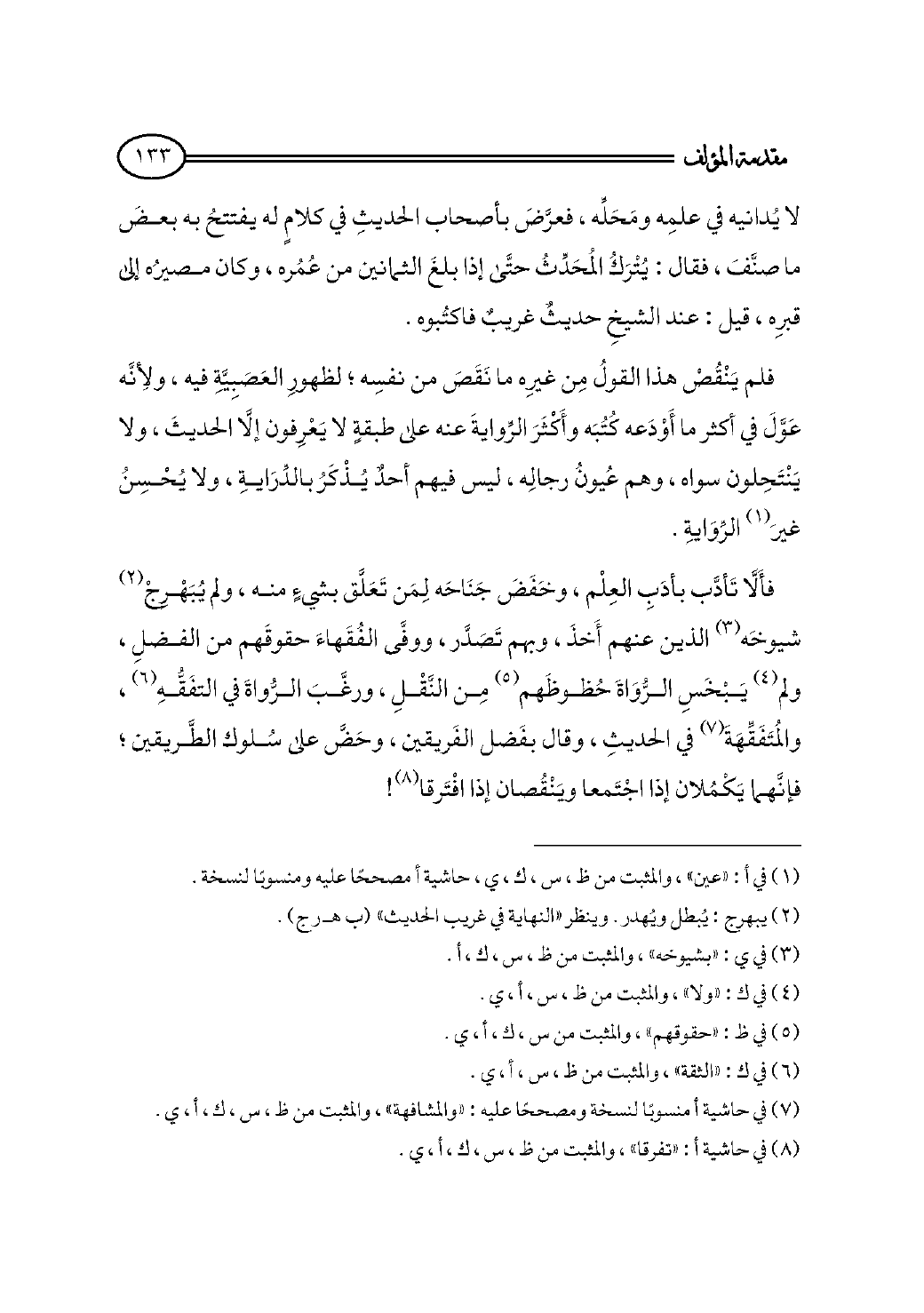 فأَلَّا تَأدَّب بأدَبِ العِلْم، وخَفَضَ جَنَاحَه لِمَن تَعَلَّق بشيءٍ منه، ولم يُبَهْرِجْ (¬٢) شيوخَه (¬٣) الذين عنهم أَخذَ، وبهم تَصَدَّر، ووفَّى الفُقَهاءَ حقوقَهم من الفضلِ، ولم (¬٤) يَبْخَسِ الرُّوَاةَ حُظوظَهم (¬٥) مِن النَّقْلِ، ورغَّبَ الرُّواةَ في التفَقُّهِ (¬٦)، والمُتَفَقِّهَةَ (¬٧) في الحديثِ، وقال بفَضل الفَريقين، وحَضَّ على سُلوك الطَّريقين؛ فإنَّهما يَكْمُلان إذا اجْتَمعا ويَنْقُصان إذا افْتَرقا (¬٨)!