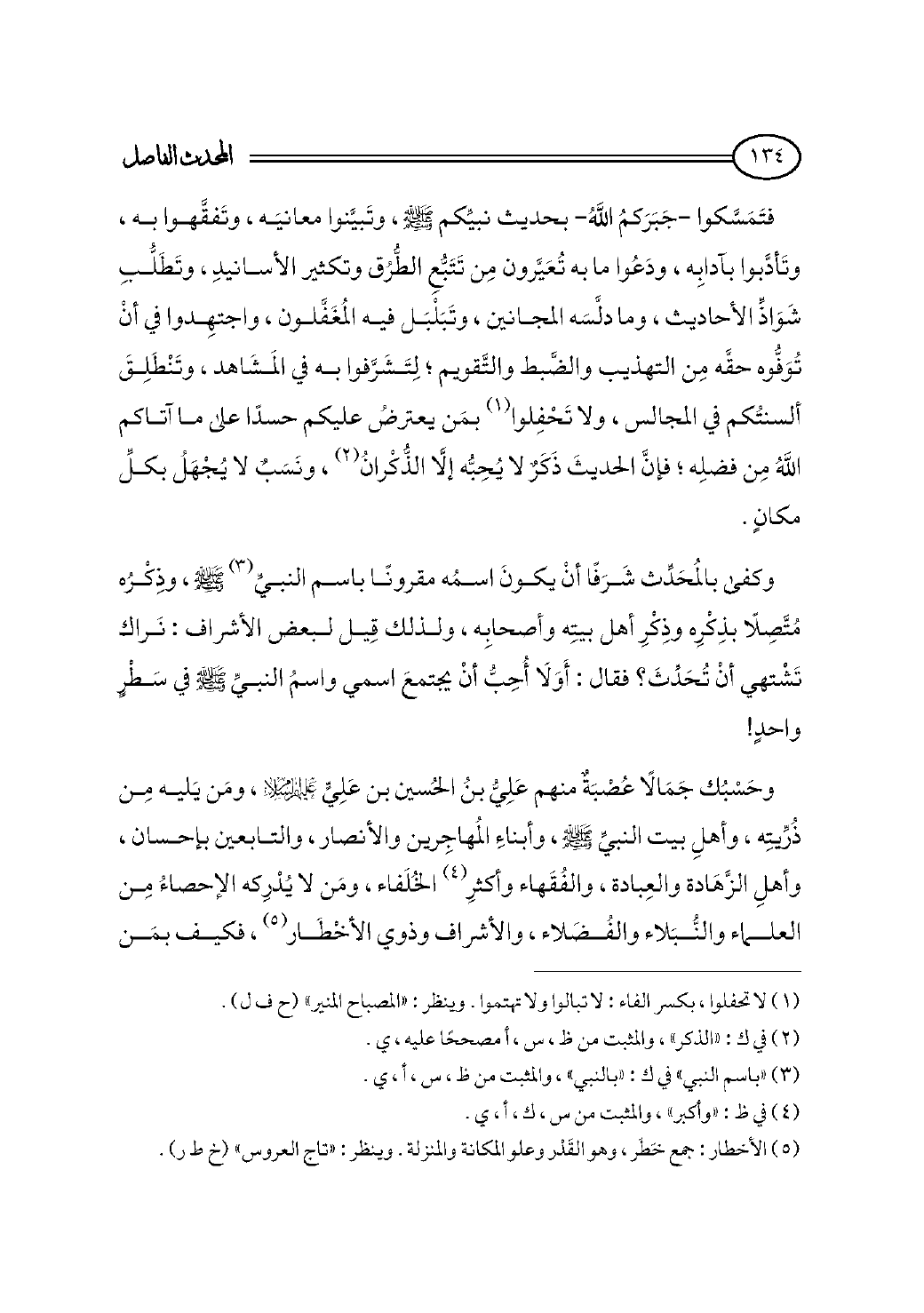 وكفى بالمُحَدِّث شَرَفًا أنْ يكونَ اسمُه مقرونًا باسم النبيِّ (¬٣) - صلى الله عليه وسلم -، وذِكْرُه مُتَّصِلًا بذِكْرِه وذِكْرِ أهل بيتِه وأصحابِه، ولذلك قِيل لبعض الأشراف: نَراك تَشْتهي أنْ تُحَدِّثَ؟ فقال: أَوَلَا أُحِبُّ أنْ يجتمعَ اسمي واسمُ النبيِّ - صلى الله عليه وسلم - في سَطْرٍ واحدٍ!