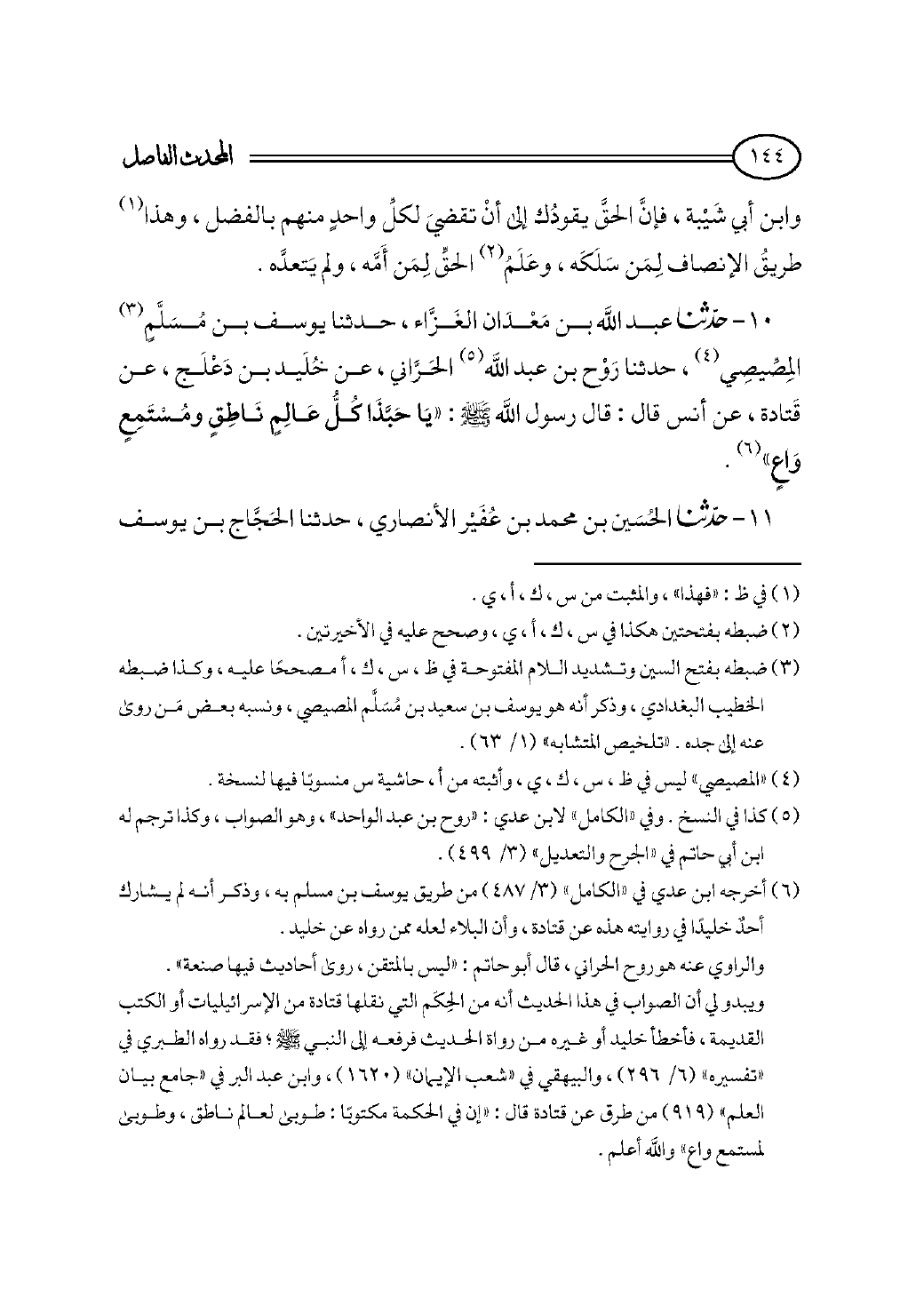 (¬٣) ضبطه بفتح السين وتشديد اللام المفتوحة في ظ، س، ك، أ مصححًا عليه، وكذا ضبطه الخطيب البغدادي، وذكر أنه هو يوسف بن سعيد بن مُسَلَّم المصيصي، ونسبه بعض مَن روى عنه إلى جده. «تلخيص المتشابه» (١/ ٦٣).