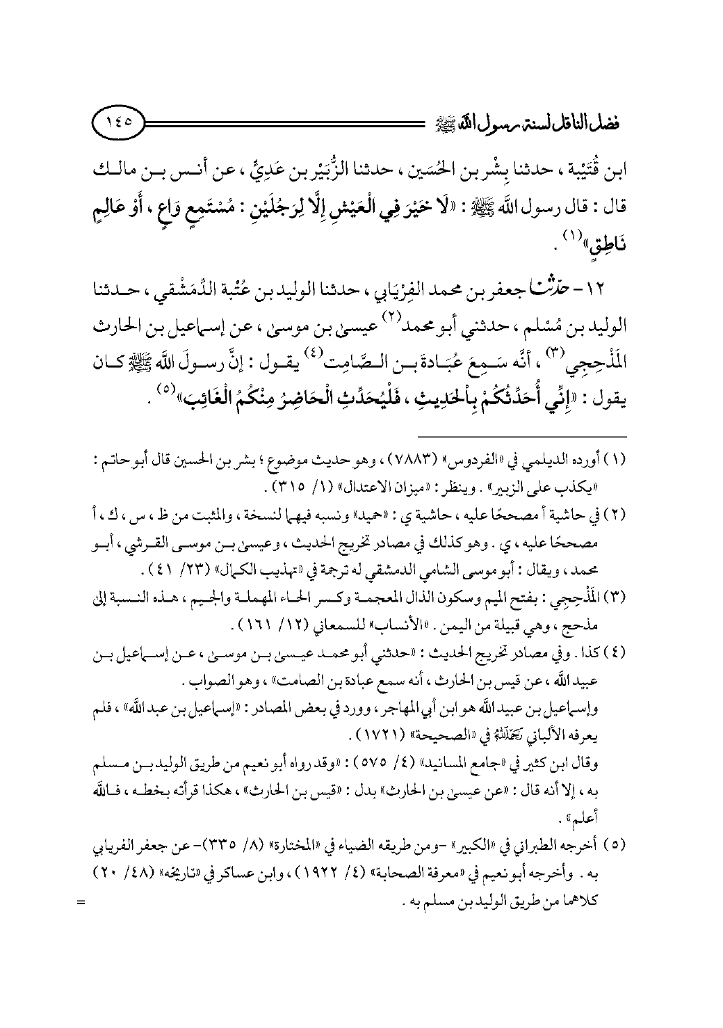 ابن قُتَيْبة، حدثنا بِشْر بن الحُسَين، حدثنا الزُّبَيْر بن عَدِيٍّ، عن أنس بن مالك قال: قال رسول الله - صلى الله عليه وسلم - : «لَا خَيْرَ فِي الْعَيْشِ إِلَّا لِرَجُلَيْنِ: مُسْتَمِعٍ وَاعٍ، أَوْ عَالِمٍ نَاطِقٍ» (¬١).