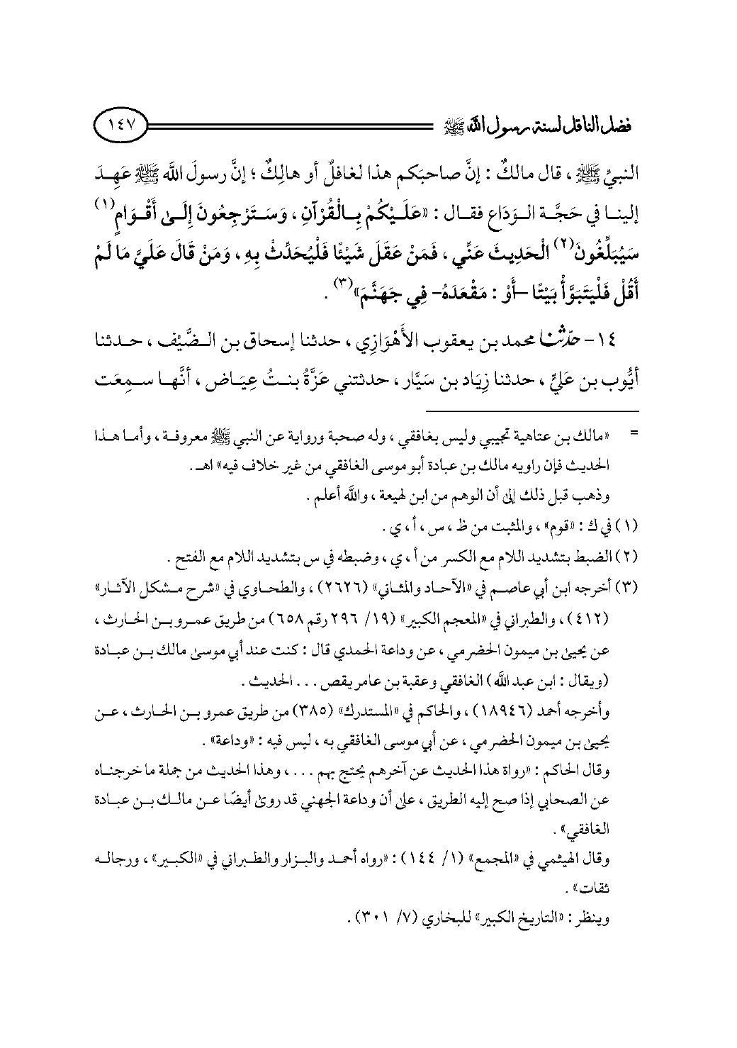 النبيِّ - صلى الله عليه وسلم - ، قال مالكٌ: إنَّ صاحبَكم هذا لغافلٌ أو هالِكٌ؛ إنَّ رسولَ الله - صلى الله عليه وسلم - عَهِدَ إلينا في حَجَّة الوَدَاع فقال: «عَلَيْكُمْ بِالْقُرْآنِ، وَسَتَرْجِعُونَ إِلَى أَقْوَامٍ (¬١) سَيُبَلِّغُونَ (¬٢) الْحَدِيثَ عَنِّي، فَمَنْ عَقَلَ شَيْئًا فَلْيُحَدِّثْ بِهِ، وَمَنْ قَالَ عَلَيَّ مَا لَمْ أَقُلْ فَلْيَتَبَوَّأْ بَيْتًا -أَوْ: مَقْعَدَهُ- فِي جَهَنَّمَ» (¬٣).