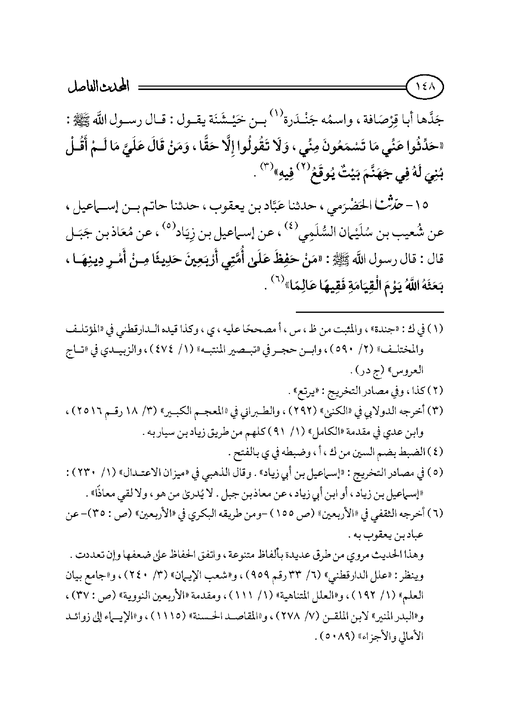 ١٥ - حدثنا الحَضْرَمي، حدثنا عَبَّاد بن يعقوب، حدثنا حاتم بن إسماعيل، عن شُعيب بن سُلَيْمان السُّلَمِي (¬٤)، عن إسماعيل بن زِيَاد (¬٥)، عن مُعَاذ بن جَبَل قال: قال رسول الله - صلى الله عليه وسلم - : «مَنْ حَفِظَ عَلَى أُمَّتِي أَرْبَعِينَ حَدِيثًا مِنْ أَمْرِ دِينِهَا، بَعَثَهُ اللهُ يَوْمَ الْقِيَامَةِ فَقِيهًا عَالِمًا» (¬٦).