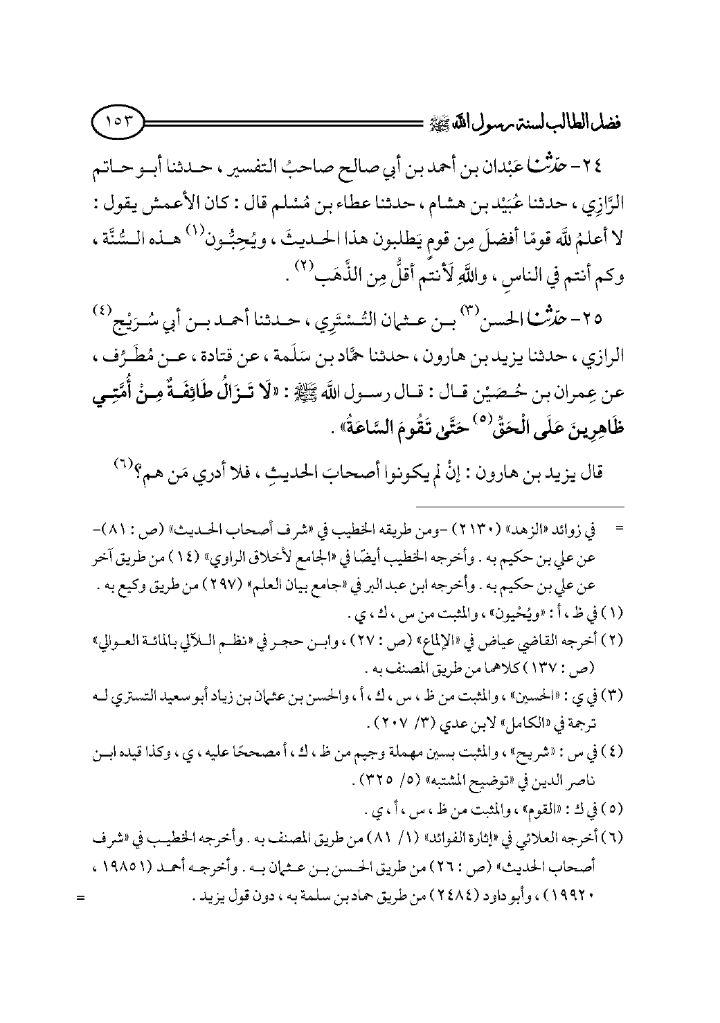 ٢٥ - حدثنا الحسن (¬٣) بن عثمان التُسْتَرِي، حدثنا أحمد بن أبي سُرَيْج (¬٤) الرازي، حدثنا يزيد بن هارون، حدثنا حمَّاد بن سَلَمة، عن قتادة، عن مُطَرِّف، عن عِمران بن حُصَيْن قال: قال رسول الله - صلى الله عليه وسلم - : «لَا تَزَالُ طَائِفَةٌ مِنْ أُمَّتِي ظَاهِرِينَ عَلَى الْحَقِّ (¬٥) حَتَّى تَقُومَ السَّاعَةُ».