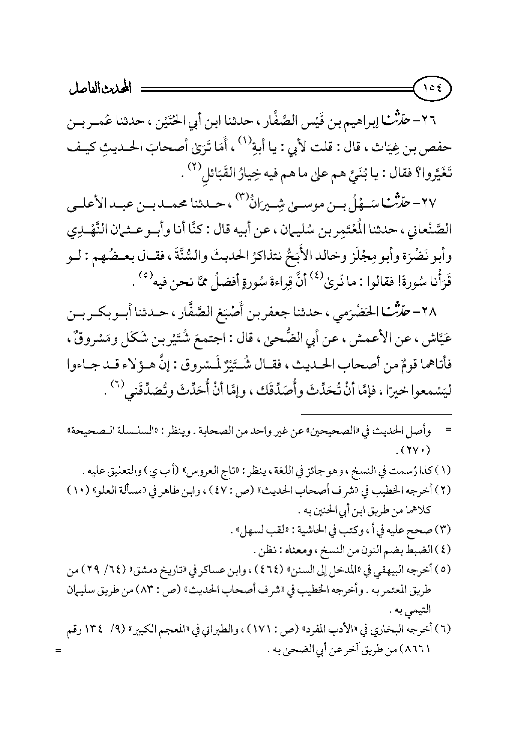 ٢٧ - حدثنا سَهْلُ بن موسى شِيرَانُ (¬٣)، حدثنا محمد بن عبد الأعلى الصَّنْعاني، حدثنا المُعْتَمِر بن سُليمان، عن أبيه قال: كنَّا أنا وأبو عثمان النَّهْدِي وأبو نَضْرَة وأبو مِجْلَز وخالد الأَبَحُّ نتذاكرُ الحديثَ والسُّنَّةَ، فقال بعضُهم: لو قَرَأْنا سُورةً! فقالوا: ما نُرى (¬٤) أنَّ قِراءةَ سُورةٍ أفضلُ ممَّا نحن فيه (¬٥).