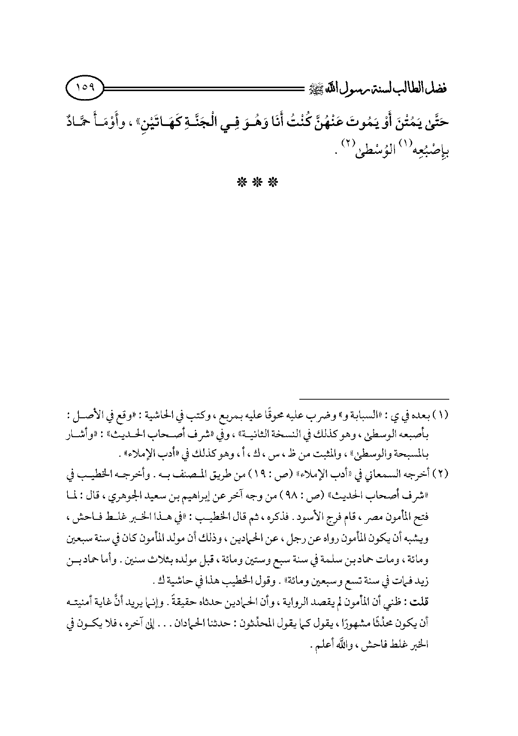 قلت: ظني أن المأمون لم يقصد الرواية، وأن الحمادين حدثاه حقيقةً. وإنما يريد أنَّ غاية أمنيته أن يكون محدِّثًا مشهورًا، يقول كما يقول المحدِّثون: حدثنا الحمادان ... إلى آخره، فلا يكون في الخبر غلط فاحش، والله أعلم.