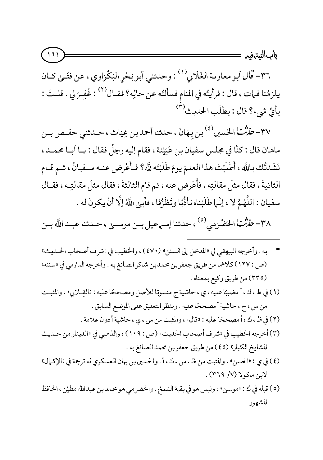 ٣٧ - حدثنا الحُسين (¬٤) بن بِهَانَ، حدثنا أحمد بن غِيَاث، حدثني حفص بن ماهان قال: كنَّا في مجلس سفيان بن عُيَيْنة، فقام إليه رجلٌ فقال: يا أبا محمد، نَشَدتُك بالله، أَطَلَبْتَ هذا العلمَ يومَ طَلَبْتَه لله؟ فأَعْرض عنه سفيانُ، ثم قام الثانيةَ، فقال مثلَ مقالتِه، فأَعْرض عنه، ثم قام الثالثةَ، فقال مثلَ مقالتِه، فقال سفيان: اللَّهُمَّ لا، إنَّما طَلَبْناه تأدُّبًا وتَظَرُّفًا، فأبى اللهُ إلَّا أنْ يكونَ له.