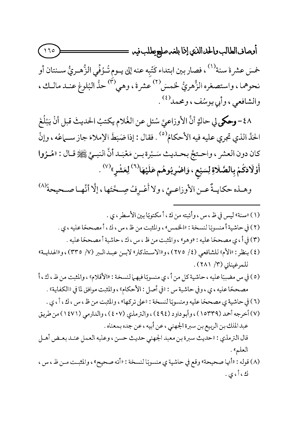 ٤٨ - وحكى لي حاكٍ أنَّ الأوزاعيَّ سُئل عن الغُلام يكتبُ الحديثَ قبل أنْ يَبْلُغَ الحَدَّ الذي تجري عليه فيه الأحكامُ (¬٥). فقال: إذا ضَبَطَ الإملاءَ جاز سماعُه، وإنْ كان دون العشر، واحتجَّ بحديث سَبْرة بن مَعْبَد أنَّ النبيَّ - صلى الله عليه وسلم - قال: «مُرُوا أَوْلَادَكُمْ بِالصَّلَاةِ لِسَبْعٍ، وَاضْرِبُوهُم عَلَيْهَا (¬٦) لِعَشْرٍ» (¬٧).