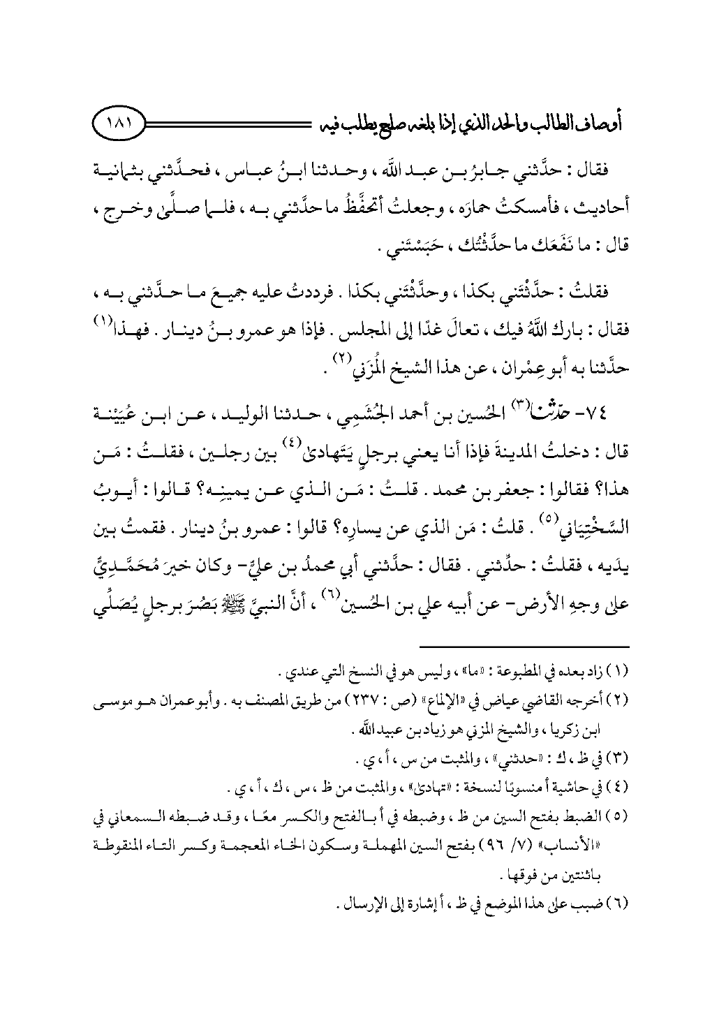 ٧٤ - حدثنا (¬٣) الحُسين بن أحمد الجُشَمِي، حدثنا الوليد، عن ابن عُيَيْنة قال: دخلتُ المدينةَ فإذا أنا يعني برجلٍ يَتَهادى (¬٤) بين رجلين، فقلتُ: مَن هذا؟ فقالوا: جعفر بن محمد. قلتُ: مَن الذي عن يمينِه؟ قالوا: أيوبُ السَّخْتِيَاني (¬٥). قلتُ: مَن الذي عن يسارِه؟ قالوا: عمرو بنُ دينار. فقمتُ بين يدَيه، فقلتُ: حدِّثني. فقال: حدَّثني أبي محمدُ بن عليٍّ- وكان خيرَ مُحَمَّدِيٍّ على وجهِ الأرض- عن أبيه علي بن الحُسين (¬٦)، أنَّ النبيَّ - صلى الله عليه وسلم - بَصُرَ برجلٍ يُصَلِّي