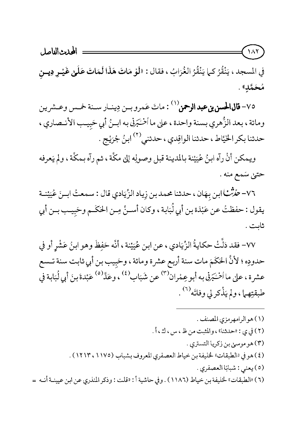 (¬٦) «الطبقات» لخليفة بن خياط (١١٨٦). وفي حاشية أ: «قلت: وذكر المنذري عن ابن عيينة أنه قال: جالست عبدة بن أبي لبابة سنة ثلاث وعشرين» اهـ. أقول: وُلد ابن عيينة سنة (١٠٧ هـ)، فعلى هذا يكون سنُّه حين جالس عبدة ست عشرة سنة. والله أعلم.