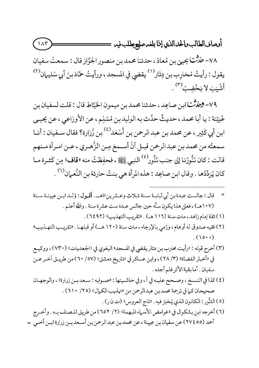 ٧٨ - حدثنا يحيى بن مُعاذ، حدثنا محمد بن منصور الجَوَّاز قال: سمعتُ سفيان يقول: رأيتُ مُحَارِب بن دِثَار (¬١) يقضي في المسجد، ورأيتُ حمَّادَ بنَ أبي سُليمان (¬٢) أَشْيَبَ لا يَخْضِبُ (¬٣).