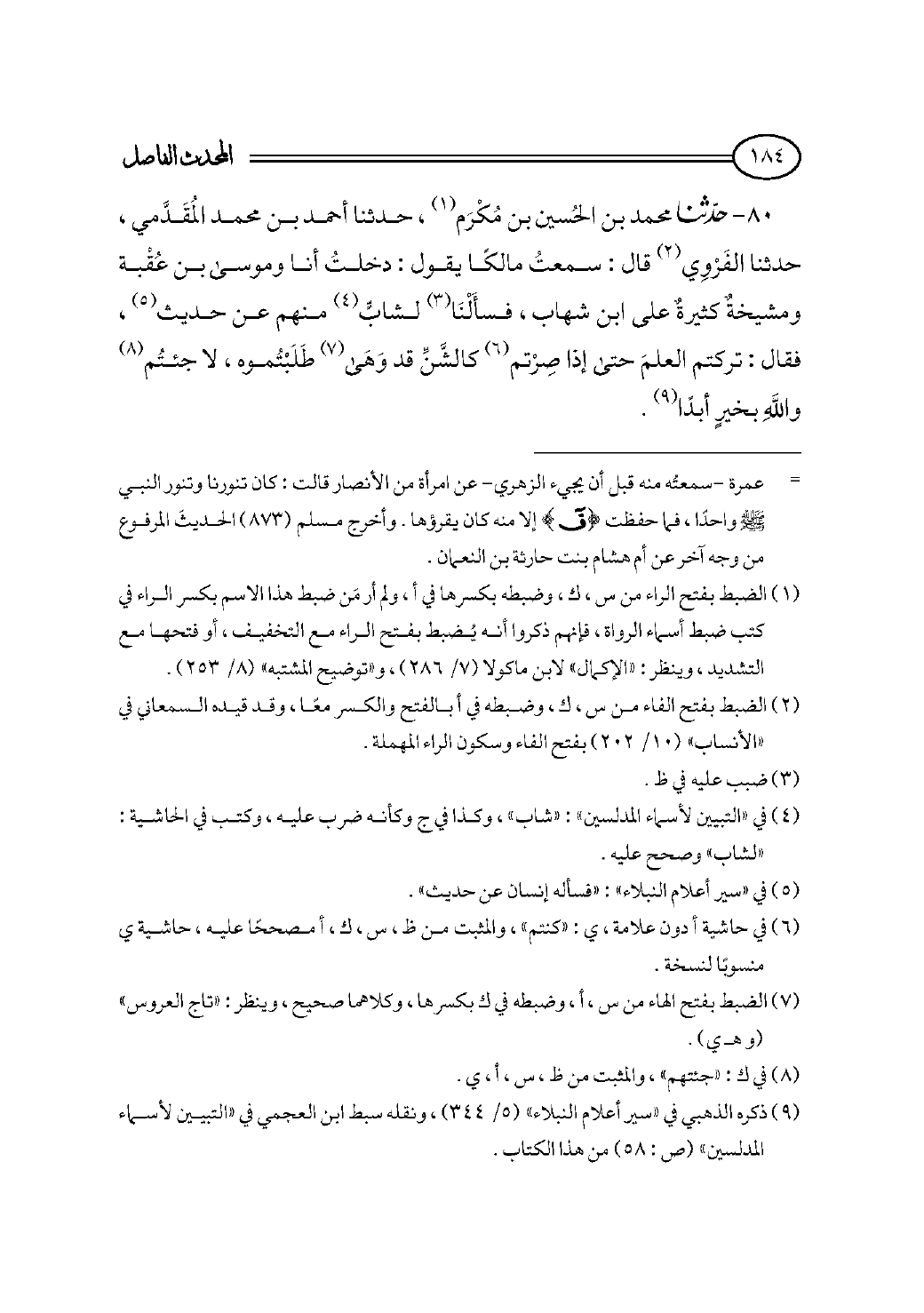 ٨٠ - حدثنا محمد بن الحُسين بن مُكْرَم (¬١)، حدثنا أحمد بن محمد المُقَدَّمي، حدثنا الفَرْوِي (¬٢) قال: سمعتُ مالكًا يقول: دخلتُ أنا وموسى بن عُقْبة ومشيخةٌ كثيرةٌ على ابن شهاب، فسأَلْنَا (¬٣) لشابٍّ (¬٤) منهم عن حديث (¬٥)، فقال: تركتم العلمَ حتى إذا صِرْتم (¬٦) كالشَّنِّ قد وَهَى (¬٧) طَلَبْتُموه، لا جئتُم (¬٨) واللهِ بخيرٍ أبدًا (¬٩).