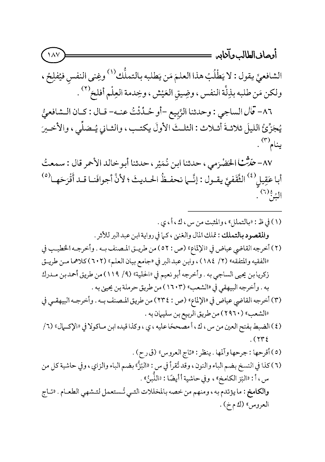 (¬٢) أخرجه القاضي عياض في «الإلماع» (ص: ٥٢) من طريق المصنف به. وأخرجه الخطيب في «الفقيه والمتفقه» (٢/ ١٨٤)، وابن عبد البر في «جامع بيان العلم» (٦٠٢) كلاهما من طريق زكريا بن يحيى الساجي به. وأخرجه أبو نعيم في «الحلية» (٩/ ١١٩) من طريق أحمد بن مدرك به. وأخرجه البيهقي في «الشعب» (١٦٠٣) من طريق حرملة بن يحيى به.