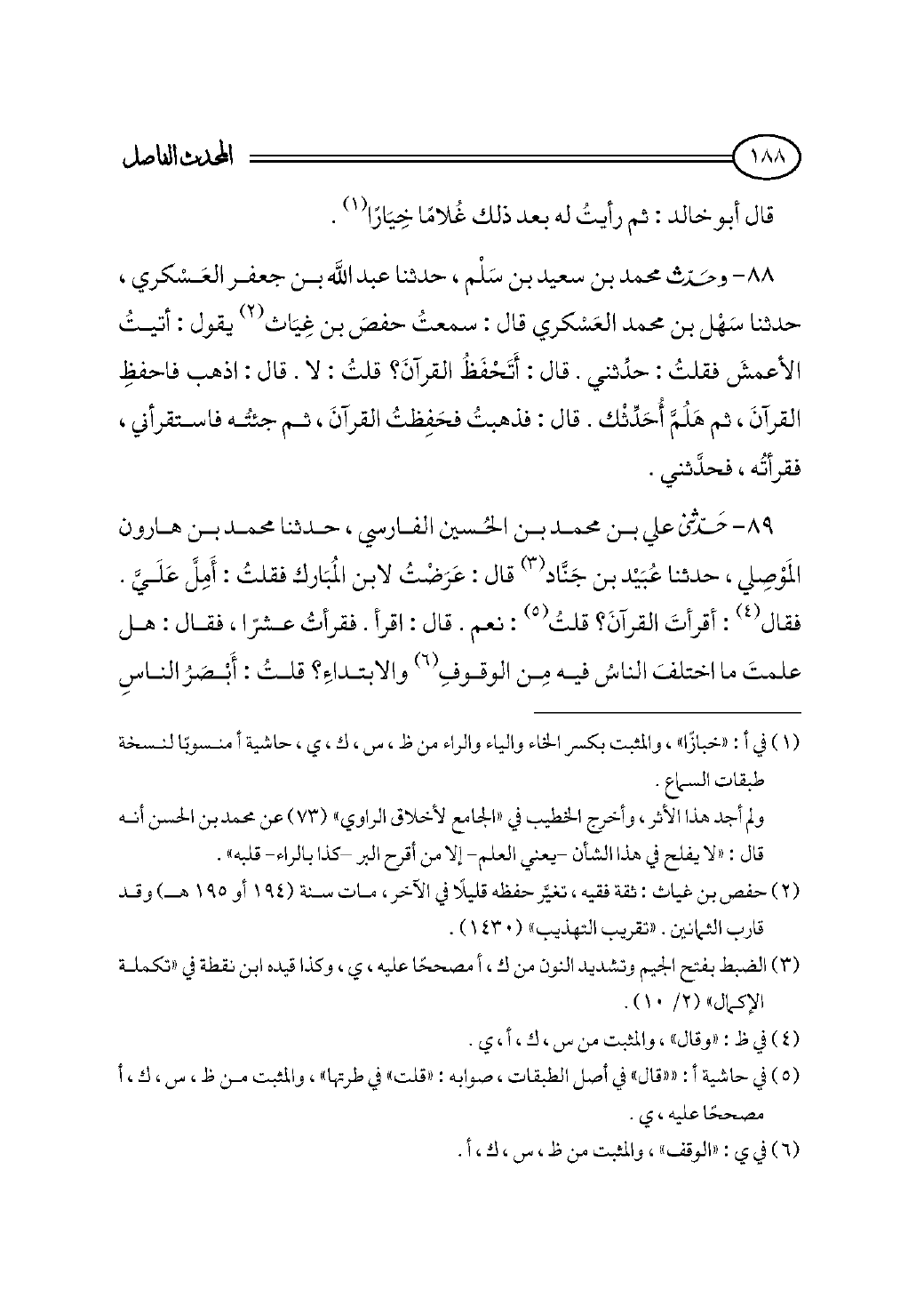 ٨٨ - وحدث محمد بن سعيد بن سَلْم، حدثنا عبد الله بن جعفر العَسْكري، حدثنا سَهْل بن محمد العَسْكري قال: سمعتُ حفصَ بن غِيَاث (¬٢) يقول: أتيتُ الأعمشَ فقلتُ: حدِّثني. قال: أَتَحْفَظُ القرآنَ؟ قلتُ: لا. قال: اذهب فاحفظِ القرآنَ، ثم هَلُمَّ أُحَدِّثْك. قال: فذهبتُ فحَفِظتُ القرآنَ، ثم جئتُه فاستقرأني، فقرأتُه، فحدَّثني.