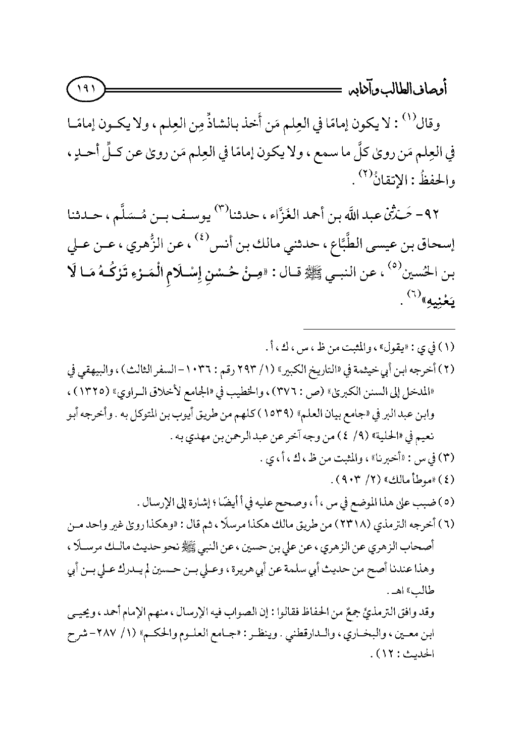 ٩٢ - حدثني عبد الله بن أحمد الغَزَّاء، حدثنا (¬٣) يوسف بن مُسَلَّم، حدثنا إسحاق بن عيسى الطَّبَّاع، حدثني مالك بن أنس (¬٤)، عن الزُّهري، عن علي بن الحُسين (¬٥)، عن النبي - صلى الله عليه وسلم - قال: «مِنْ حُسْنِ إِسْلَامِ الْمَرْءِ تَرْكُهُ مَا لَا يَعْنِيهِ» (¬٦).