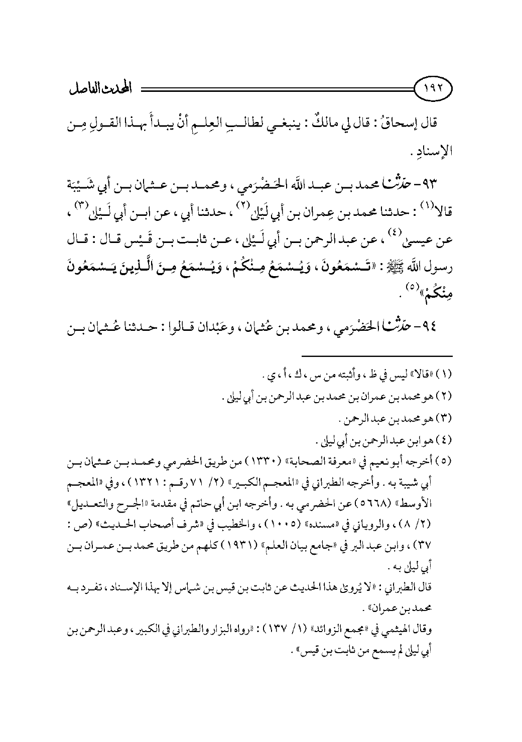 ٩٣ - حدثنا محمد بن عبد الله الحَضْرَمي، ومحمد بن عثمان بن أبي شَيْبَة قالا (¬١): حدثنا محمد بن عِمران بن أبي لَيْلى (¬٢)، حدثنا أبي، عن ابن أبي لَيْلى (¬٣)، عن عيسى (¬٤)، عن عبد الرحمن بن أبي لَيْلى، عن ثابت بن قَيْس قال: قال رسول الله - صلى الله عليه وسلم - : «تَسْمَعُونَ، وَيُسْمَعُ مِنْكُمْ، وَيُسْمَعُ مِنَ الَّذِينَ يَسْمَعُونَ مِنْكُمْ» (¬٥).