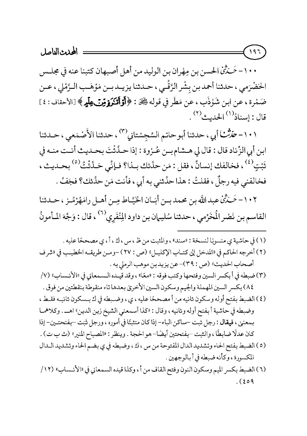 ١٠٠ - حدثني الحسن بن مِهْران بن الوليد من أهل أصبهان كتبنا عنه في مجلس الحَضْرَمي، حدثنا أحمد بن بِشْر الرَّقِّي، حدثنا يزيد بن مَوْهَب الرَّمْلي، عن ضَمْرة، عن ابن شَوْذَب، عن مَطَر في قوله - عز وجل -: {أَوْ أَثَارَةٍ مِنْ عِلْمٍ} [الأحقاف: ٤] قال: إسنادُ (¬١) الحديث (¬٢).