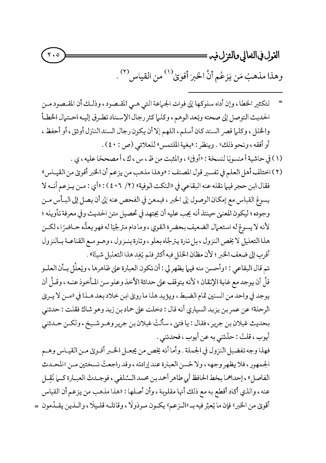 فهذا وجه تفضيل النزول في الجملة. وأما أنه يخص من يجعل الخبر أقوى من القياس وهم الجمهور، فلا يظهر وجهه، ولا حُسن العبارة عند إرادته، وقد راجعتُ نسختين من «المحدث الفاصل»، إحداهما بخط الحافظ أبي طاهر أحمد بن محمد السِّلفي، فوجدتُ العبارة كما نُقِل عنه، والذي أكاد أقطع به مع ذلك أنها مقلوبة، وأن أصلها: «هذا مذهب من يزعم أن القياس أقوى من الخبر» فإن ما يُعبَّر فيه بـ «الزعم» يكون مرذولًا، وقائله قليلًا، والذين يقدِّمون القياس ويجوِّزون فسخه به قليل جدًّا، وأما الأول فالقائل به جمهور الناس، وهو الصحيح الذي لا يُعدل عنه، فلا يصلح التعبير في جانبه بـ «زعم» على ما تعورف، ويكون مراد ابن خلاد التشنيع عليه بأن مراده إسقاط خبر الواحد، فإنه إذا فَضَّل النزول أبطل الرحلة، ومتى بطلت الرحلة، قلَّت الرغبة في الخبر وسقط كثير منه وضعف أمره، فآل ذلك إلى عدمه، وعدم التعويل عليه.