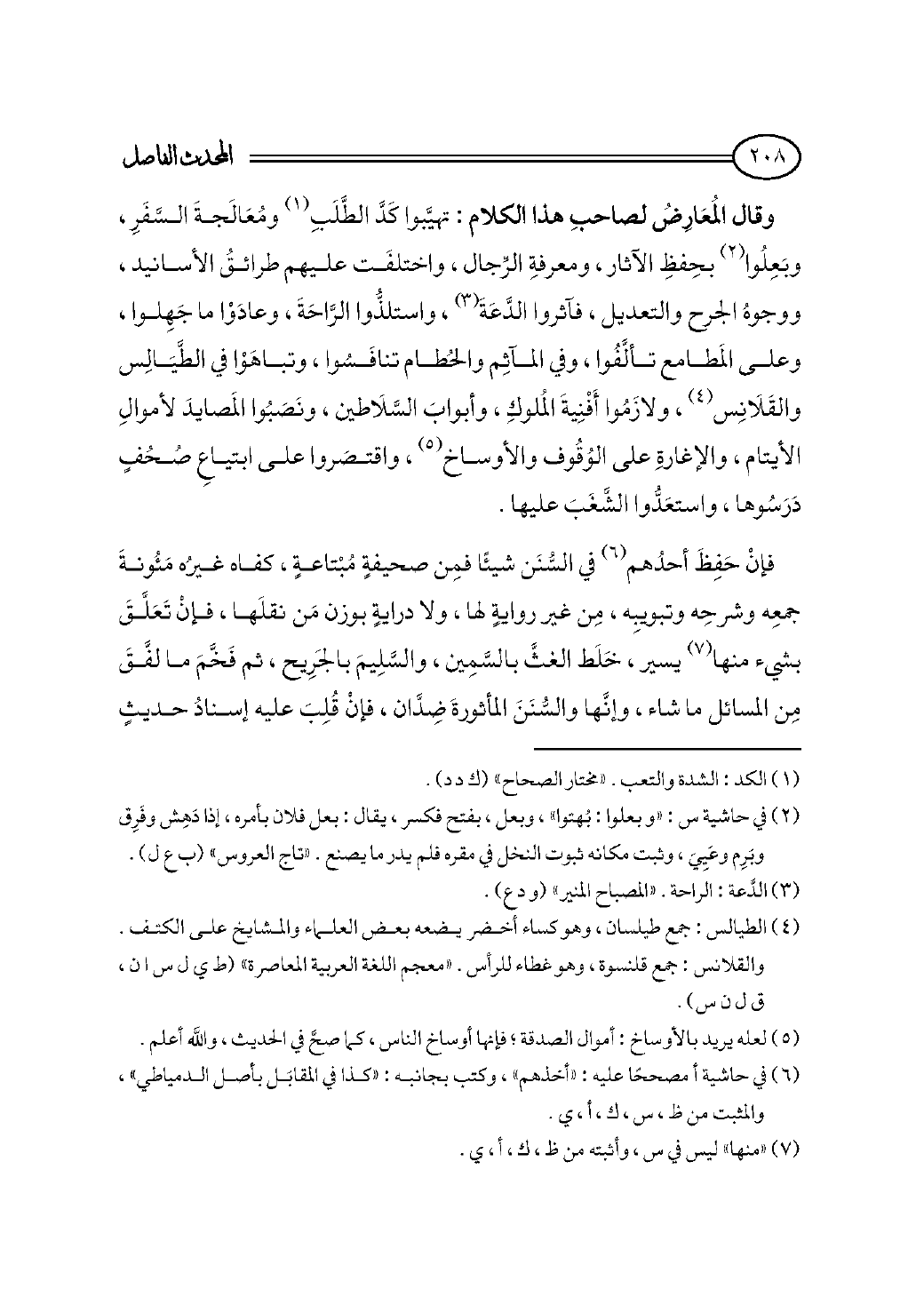فإنْ حَفِظَ أحدُهم (¬٦) في السُّنَن شيئًا فمِن صحيفةٍ مُبْتاعةٍ، كفاه غيرُه مَئُونةَ جمعِه وشرحِه وتبويبِه، مِن غير روايةٍ لها، ولا درايةٍ بوزن مَن نقلَها، فإنْ تَعَلَّقَ بشيء منها (¬٧) يسير، خَلَط الغثَّ بالسَّمِين، والسَّلِيمَ بالجَرِيح، ثم فَخَّمَ ما لفَّقَ مِن المسائل ما شاء، وإنَّها والسُّنَنَ المأثورةَ ضِدَّان، فإنْ قُلِبَ عليه إسنادُ حديثٍ