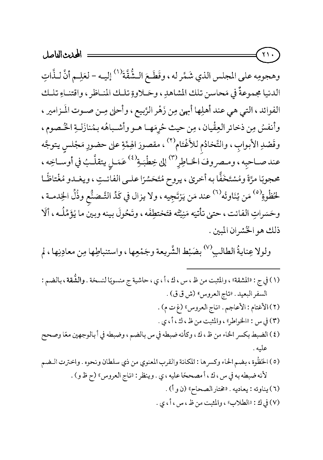 إليه - لعَلِم أنَّ لذَّاتِ الدنيا مجموعةٌ في مَحاسن تلك المشاهدِ، وحَلاوةِ تلك المناظر، واقتناءِ تلك الفوائد، التي هي عند أهلِها أبهى مِن زَهْر الرَّبيع، وأحلى مِن صوت المَزامير، وأنفسُ مِن ذخائر العِقْيان، مِن حيث حُرِمَها هو وأشباهُه بمُنازَلةِ الخُصوم، وقَصْدِ الأبوابِ، والتَّخادُمِ للأَغْتَام (¬٢)، مقصورَ الهِمَّةِ على حضورِ مَجْلسٍ يتوجَّه عند صاحبِه، ومصروفَ الخاطِرِ (¬٣) إلى خِطْبَةِ (¬٤) عَمَلٍ يتقلَّبُ في أوساخِه، محجوبًا مرَّةً ومُسْتَخَفًّا به أخرى، يروح مُتَحَسِّرًا على الفائتِ، ويغدو مُغْتاظًا لحُظْوةِ (¬٥) مَن يُنَاوئُه (¬٦) عند مَن يَرْتَجِيه، ولا يزال في كَدِّ التَّصَنُّعِ وذُلِّ الخِدمة، وحَسَراتِ الفائت، حتى تأتيَه مَنِيَّتُه فتَختطِفَه، وتَحُولَ بينه وبين ما يُؤَمِّلُه، ألَا ذلك هو الخُسْران المبين.
