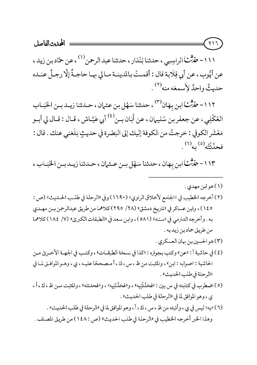 (¬٢) أخرجه الخطيب في «الجامع لأخلاق الراوي» (١٦٩٠) وفي «الرحلة في طلب الحديث» (ص: ١٤٥)، وابن عساكر في «تاريخ دمشق» (٢٨/ ٢٩٥) كلاهما من طريق عبدالرحمن بن مهدي به. وأخرجه الدارمي في «سننه» (٥٨١)، وابن سعد في «الطبقات الكبرى» (٧/ ١٨٤) كلاهما من طريق حماد بن زيد به.