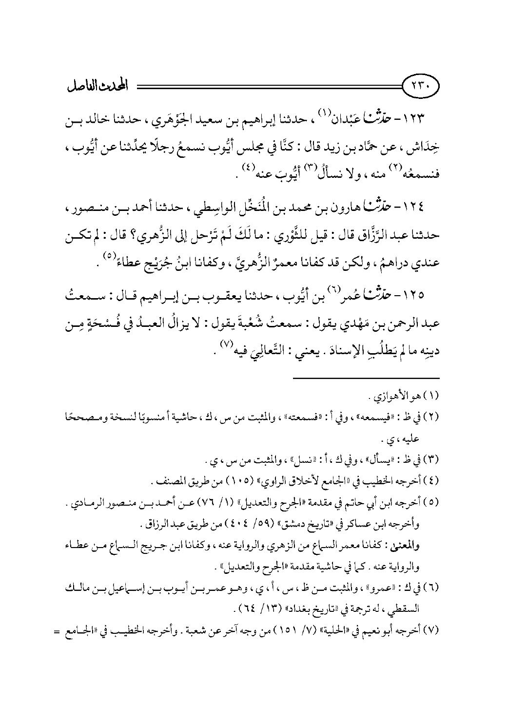 ١٢٣ - حدثنا عَبْدان (¬١)، حدثنا إبراهيم بن سعيد الجَوْهَري، حدثنا خالد بن خِدَاش، عن حمَّاد بن زيد قال: كنَّا في مجلس أيُّوب نسمعُ رجلًا يحدِّثنا عن أيُّوب، فنسمعُه (¬٢) منه، ولا نسألُ (¬٣) أيُّوبَ عنه (¬٤).