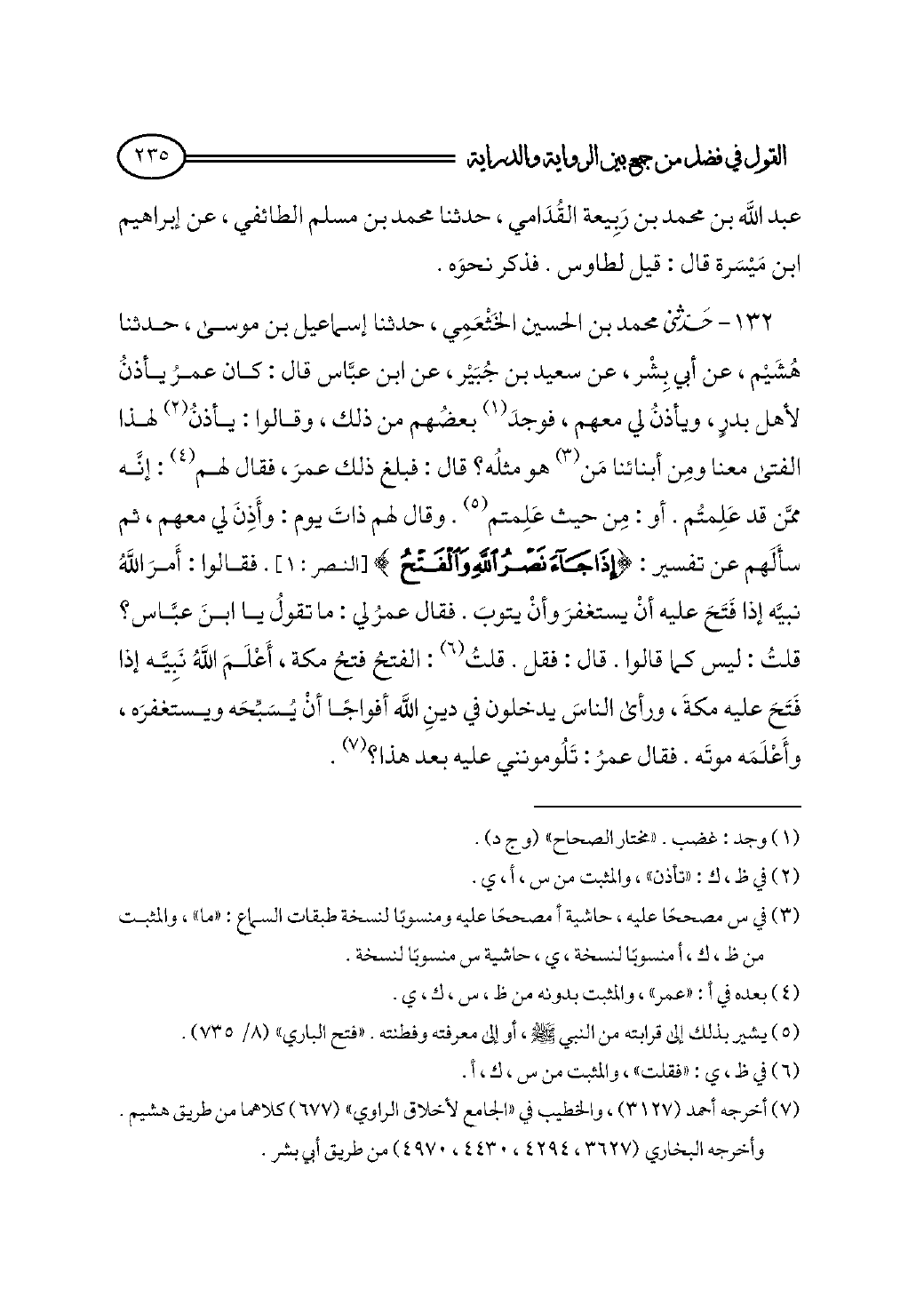 ١٣٢ - حدثني محمد بن الحسين الخَثْعَمِي، حدثنا إسماعيل بن موسى، حدثنا هُشَيْم، عن أبي بِشْر، عن سعيد بن جُبَيْر، عن ابن عبَّاس قال: كان عمرُ يأذنُ لأهل بدرٍ، ويأذنُ لي معهم، فوجدَ (¬١) بعضُهم من ذلك، وقالوا: يأذنُ (¬٢) لهذا الفتى معنا ومِن أبنائنا مَن (¬٣) هو مثلُه؟ قال: فبلغ ذلك عمرَ، فقال لهم (¬٤): إنَّه ممَّن قد عَلِمتُم. أو: مِن حيث عَلِمتم (¬٥). وقال لهم ذاتَ يوم: وأَذِنَ لي معهم، ثم سأَلَهم عن تفسير: {إِذَا جَاءَ نَصْرُ اللَّهِ وَالْفَتْحُ} [النصر: ١]. فقالوا: أَمرَ اللهُ نبيَّه إذا فَتَحَ عليه أنْ يستغفرَ وأنْ يتوبَ. فقال عمرُ لي: ما تقولُ يا ابنَ عبَّاس؟ قلتُ: ليس كما قالوا. قال: فقل. قلتُ (¬٦): الفتحُ فتحُ مكة، أَعْلَمَ اللهُ نَبِيَّه إذا فَتَحَ عليه مكةَ، ورأى الناسَ يدخلون في دينِ الله أفواجًا أنْ يُسَبِّحَه ويستغفرَه، وأَعْلَمَه موتَه. فقال عمرُ: تَلُومونني عليه بعد هذا؟ (¬٧).