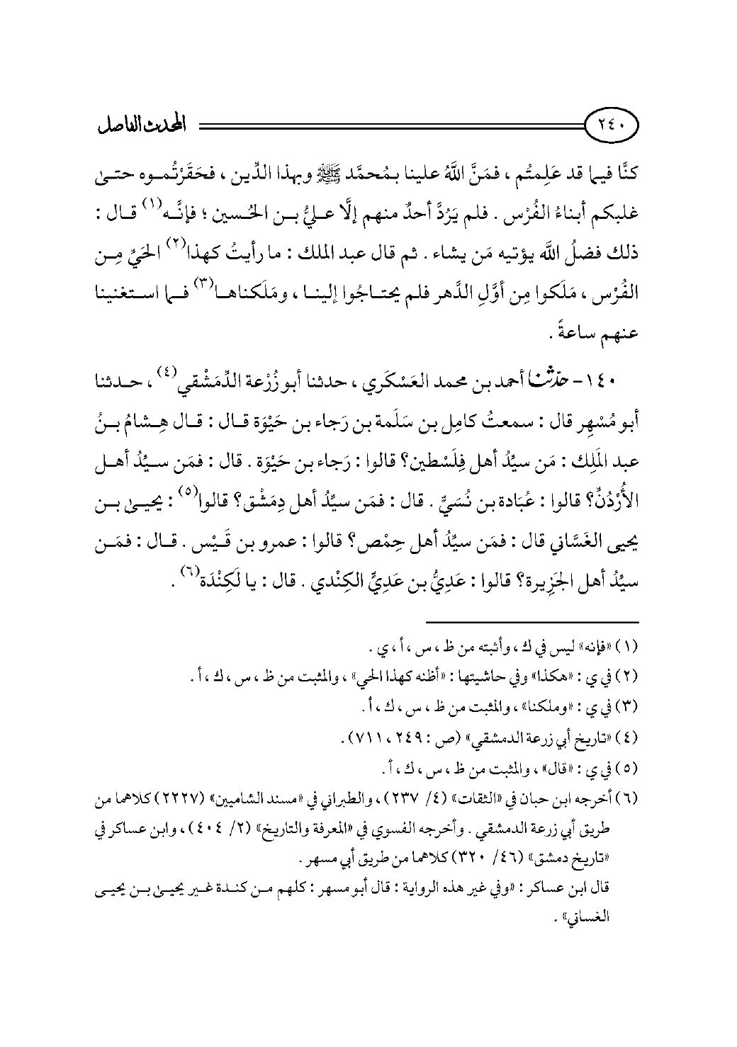 ١٤٠ - حدثنا أحمد بن محمد العَسْكَري، حدثنا أبو زُرْعة الدِّمَشْقي (¬٤)، حدثنا أبو مُسْهِر قال: سمعتُ كامِل بن سَلَمة بن رَجاء بن حَيْوَة قال: قال هِشامُ بنُ عبد المَلِك: مَن سيِّدُ أهل فِلَسْطين؟ قالوا: رَجاء بن حَيْوَة. قال: فمَن سيِّدُ أهل الأُرْدُنِّ؟ قالوا: عُبَادة بن نُسَيٍّ. قال: فمَن سيِّدُ أهل دِمَشْق؟ قالوا (¬٥): يحيى بن يحيى الغَسَّاني قال: فمَن سيِّدُ أهل حِمْص؟ قالوا: عمرو بن قَيْس. قال: فمَن سيِّدُ أهل الجَزِيرة؟ قالوا: عَدِيُّ بن عَدِيٍّ الكِنْدي. قال: يا لَكِنْدَة (¬٦).