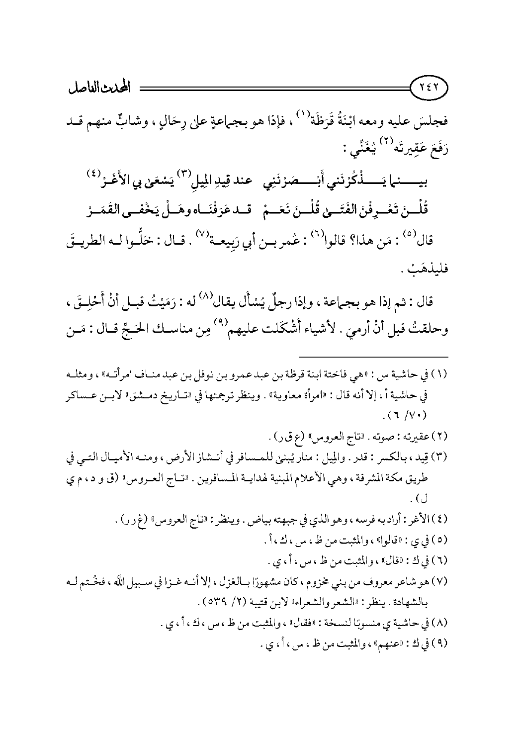 فجلسَ عليه ومعه ابْنَةُ قَرَظَة (¬١)، فإذا هو بجماعةٍ على رِحَالٍ، وشابٌّ منهم قد رَفَعَ عَقِيرتَه (¬٢) يُغَنِّي: