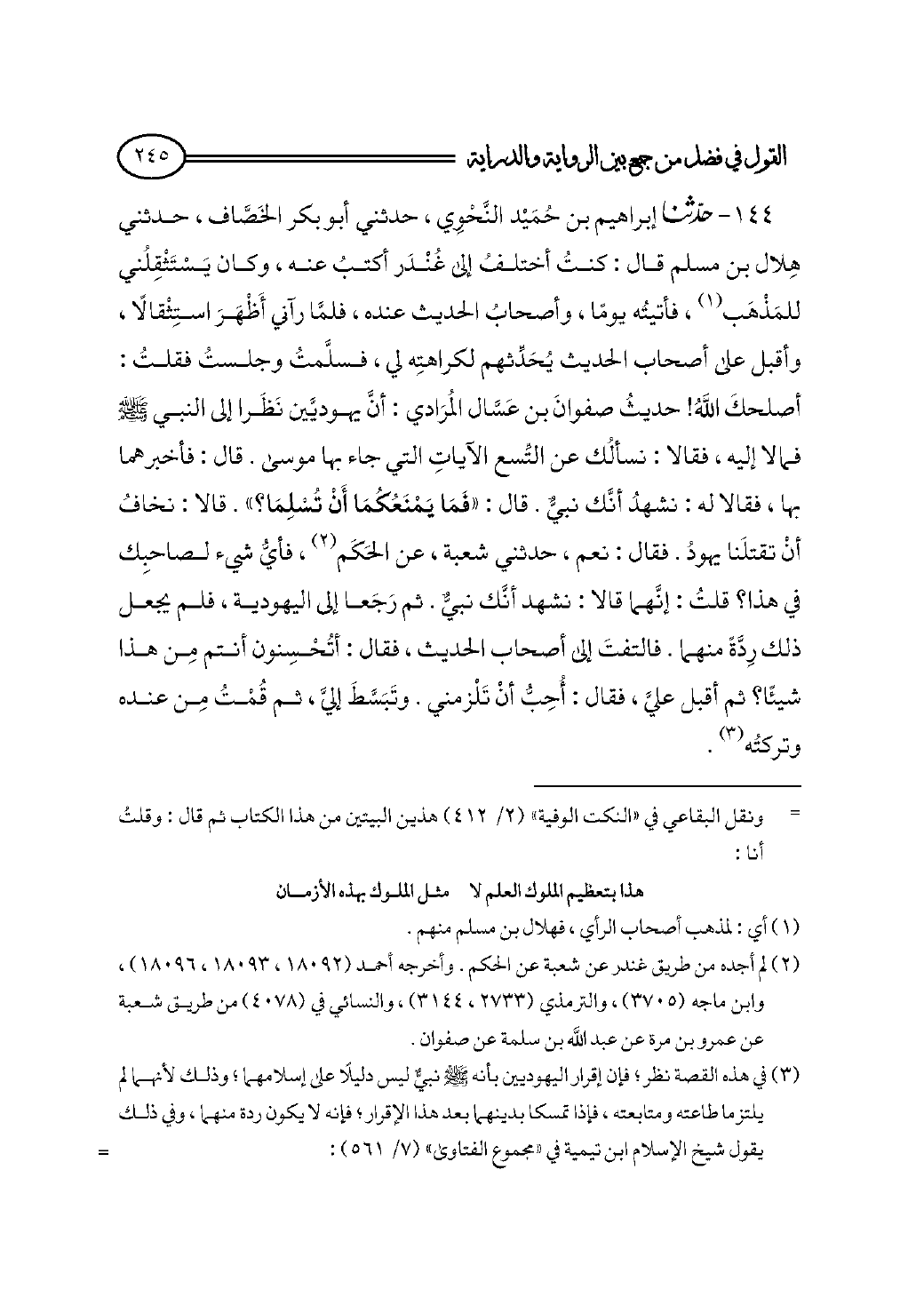 ١٤٤ - حدثنا إبراهيم بن حُمَيْد النَّحْوِي، حدثني أبو بكر الخَصَّاف، حدثني هِلال بن مسلم قال: كنتُ أختلفُ إلى غُنْدَر أكتبُ عنه، وكان يَسْتَثْقِلُني للمَذْهَب (¬١)، فأتيتُه يومًا، وأصحابُ الحديث عنده، فلمَّا رآني أَظْهَرَ استِثْقالًا، وأقبل على أصحاب الحديث يُحَدِّثهم لكراهتِه لي، فسلَّمتُ وجلستُ فقلتُ: أصلحكَ اللهُ! حديثُ صفوانَ بن عَسَّال المُرَادي: أنَّ يهوديَّين نَظَرا إلى النبي - صلى الله عليه وسلم - فمالا إليه، فقالا: نسألُك عن التِّسع الآياتِ التي جاء بها موسى. قال: فأخبرهما بها، فقالا له: نشهدُ أنَّك نبيٌّ. قال: «فَمَا يَمْنَعُكُمَا أَنْ تُسْلِمَا؟ ». قالا: نخافُ أنْ تقتلَنا يهودُ. فقال: نعم، حدثني شعبة، عن الحَكَم (¬٢)، فأيُّ شيء لصاحبِك في هذا؟ قلتُ: إنَّهما قالا: نشهد أنَّك نبيٌّ. ثم رَجَعا إلى اليهودية، فلم يجعل ذلك رِدَّةً منهما. فالتفتَ إلى أصحاب الحديث، فقال: أتُحْسِنون أنتم مِن هذا شيئًا؟ ثم أقبل عليَّ، فقال: أُحِبُّ أنْ تَلْزمني. وتَبَسَّطَ إليَّ، ثم قُمْتُ مِن عنده وتركتُه (¬٣).