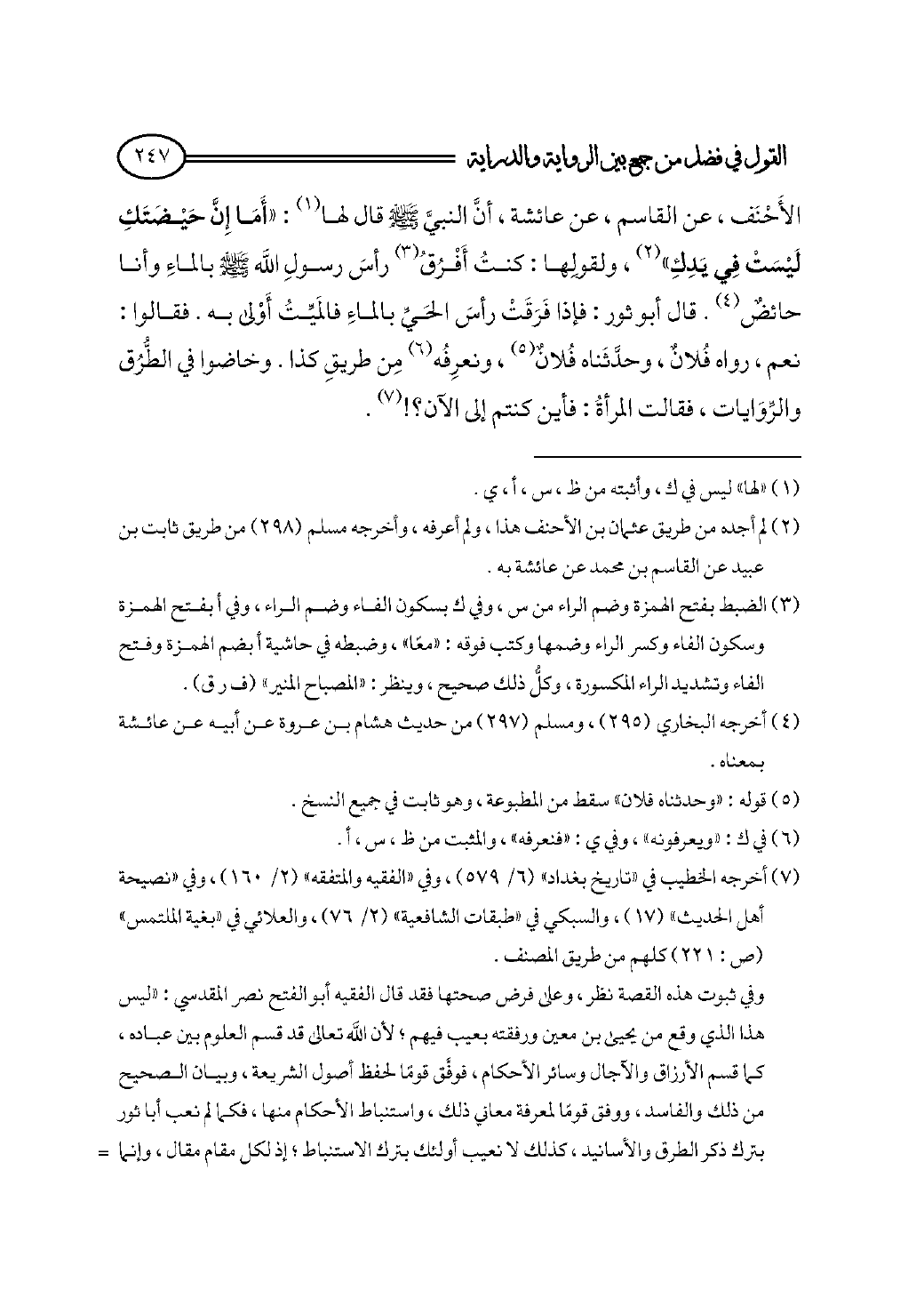 الأَحْنَف، عن القاسم، عن عائشة، أنَّ النبيَّ - صلى الله عليه وسلم - قال لها (¬١): «أَمَا إِنَّ حَيْضَتَكِ لَيْسَتْ فِي يَدِكِ» (¬٢)، ولقولِها: كنتُ أَفْرُقُ (¬٣) رأسَ رسولِ الله - صلى الله عليه وسلم - بالماءِ وأنا حائضٌ (¬٤). قال أبو ثور: فإذا فَرَقَتْ رأسَ الحَيِّ بالماءِ فالمَيِّتُ أَوْلى به. فقالوا: نعم، رواه فُلانٌ، وحدَّثَناه فُلانٌ (¬٥)، ونعرِفُه (¬٦) مِن طريقِ كذا.