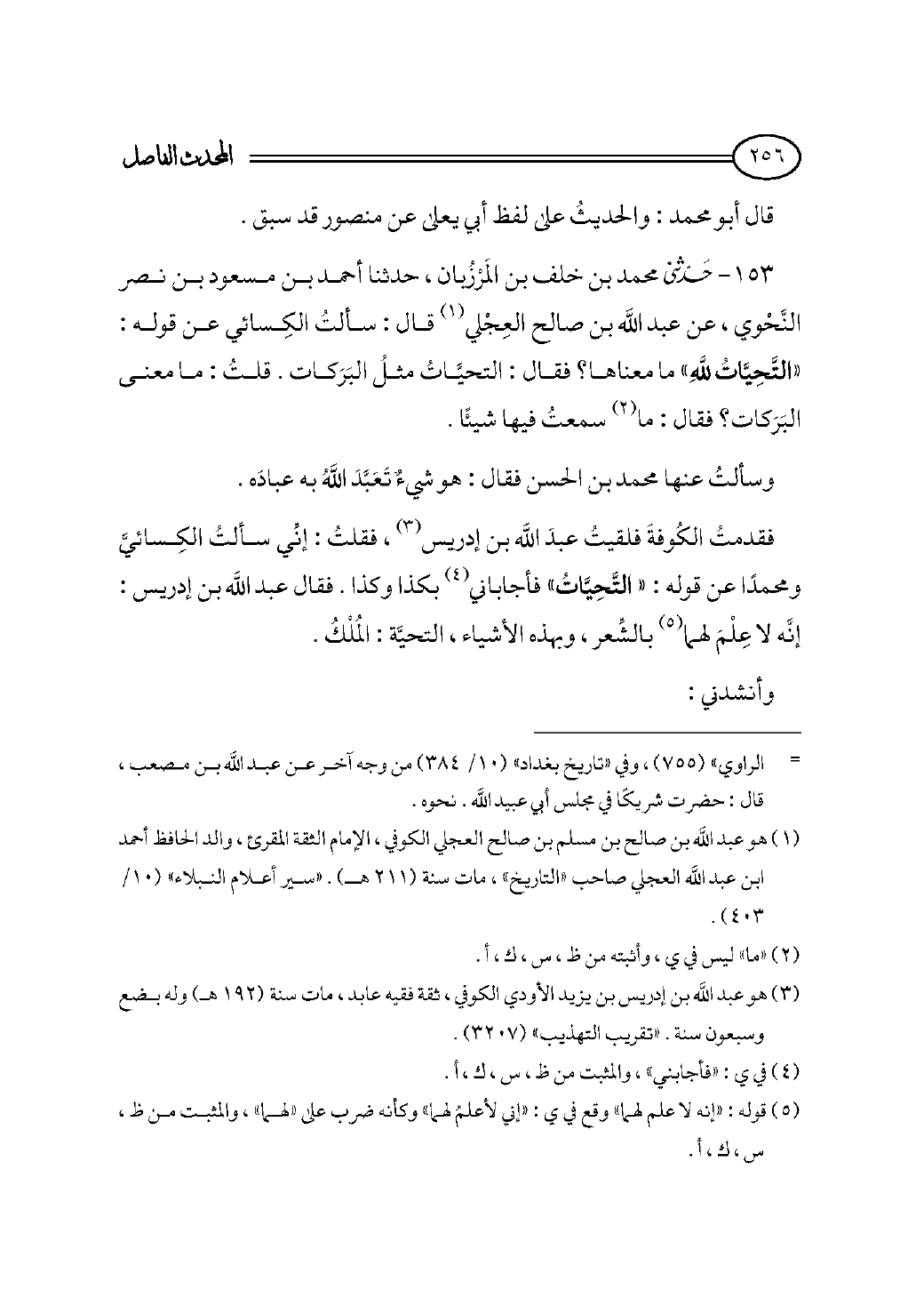 فقدمتُ الكُوفةَ فلقيتُ عبدَ الله بن إدريس (¬٣)، فقلتُ: إنِّي سألتُ الكِسائيَّ ومحمدًا عن قوله: «التَّحِيَّاتُ» فأجاباني (¬٤) بكذا وكذا. فقال عبد الله بن إدريس: إنَّه لا عِلْمَ لهما (¬٥) بالشِّعر، وبهذه الأشياء، التحيَّة: المُلْكُ.