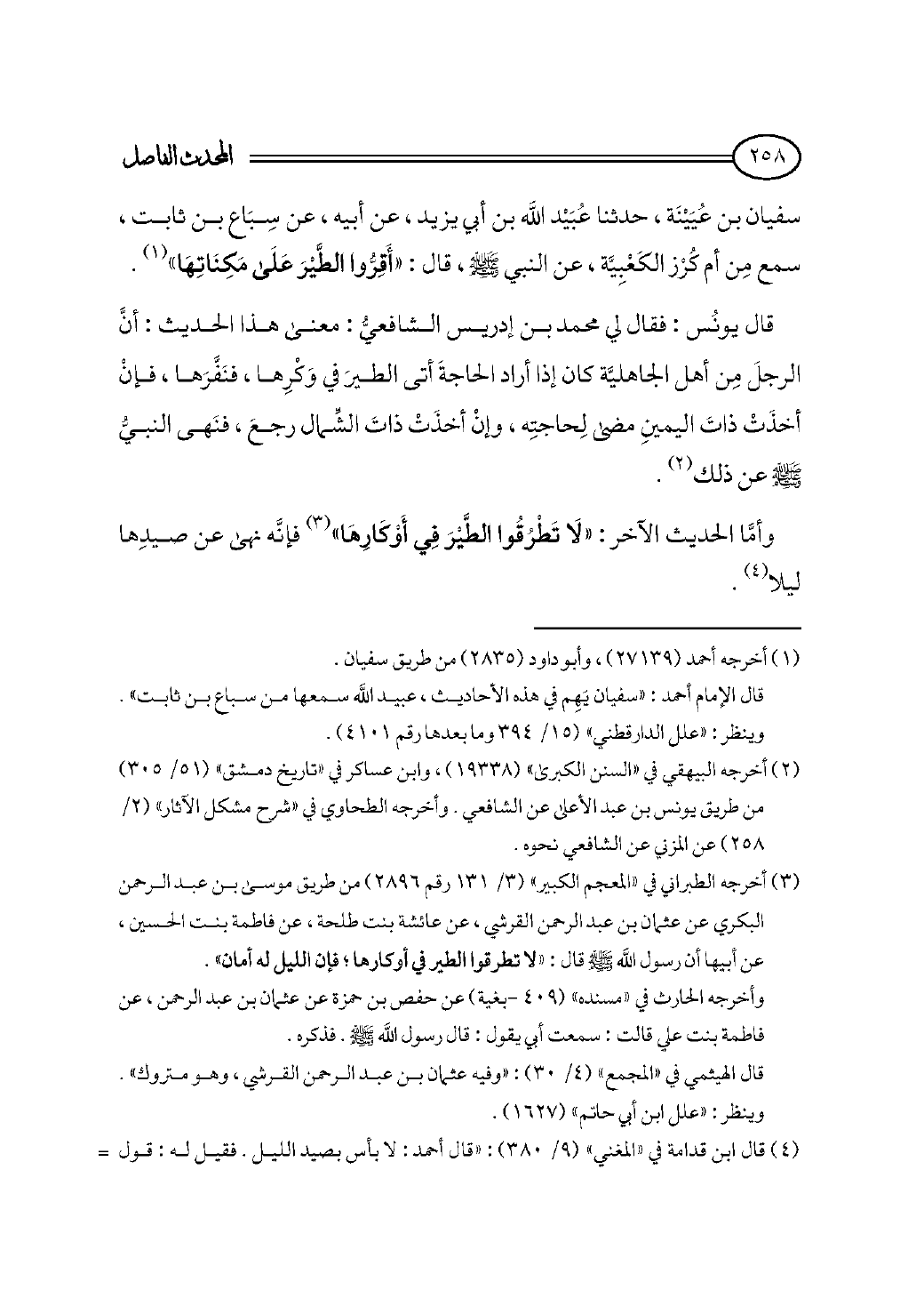 (¬٤) قال ابن قدامة في «المغني» (٩/ ٣٨٠): «قال أحمد: لا بأس بصيد الليل. فقيل له: قول النبي - صلى الله عليه وسلم -: «أقروا الطير على وكناتها»؟ فقال: هذا إذا كان أحدكم يريد الأمر، فيثير الطير حتى يتفاءل، إن كان عن يمينه قال كذا، وإن جاء عن يساره قال كذا، فقال النبي - صلى الله عليه وسلم -: «أقروا الطير على وكناتها». وروي له عن ابن عباس أن النبي - صلى الله عليه وسلم - قال: «لا تطرقوا الطير في أوكارها؛ فإن الليل لها أمان». فقال: هذا ليس بشيء، يرويه فرات بن السائب، وليس بشيء، ورواه عنه حفص بن عمر، ولا أعرفه. قال يزيد بن هارون: ما علمت أن أحدًا كره صيد الليل. وقال يحيى بن معين: ليس به بأس» اهـ.