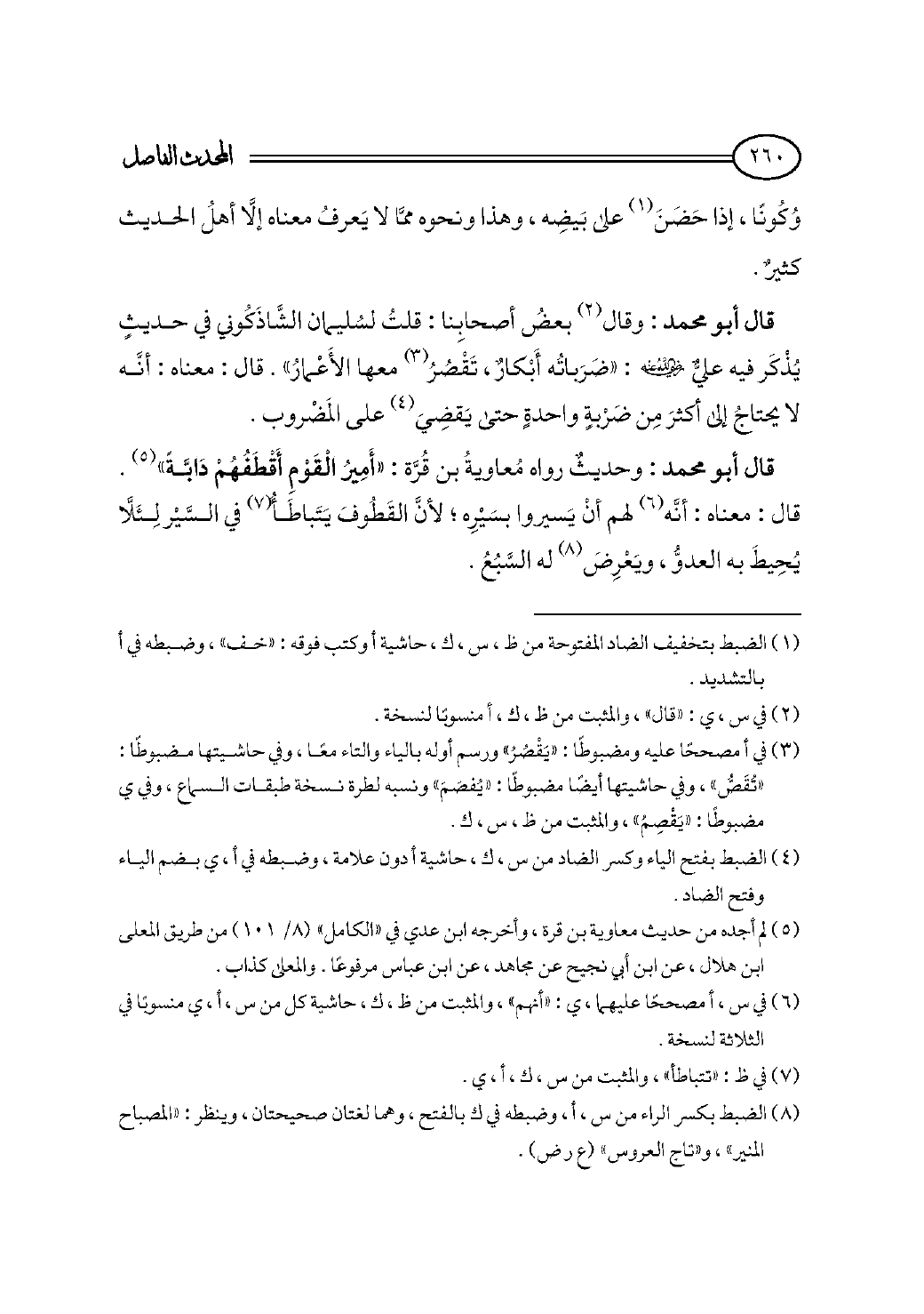 قال أبو محمد: وحديثٌ رواه مُعاويةُ بن قُرَّة: «أَمِيرُ الْقَوْمِ أَقْطَفُهُمْ دَابَّةً» (¬٥). قال: معناه: أنَّه (¬٦) لهم أنْ يَسيروا بسَيْرِه؛ لأنَّ القَطُوفَ يَتَباطَأُ (¬٧) في السَّيْر لِئَلَّا يُحِيطَ به العدوُّ، ويَعْرِضَ (¬٨) له السَّبُعُ.