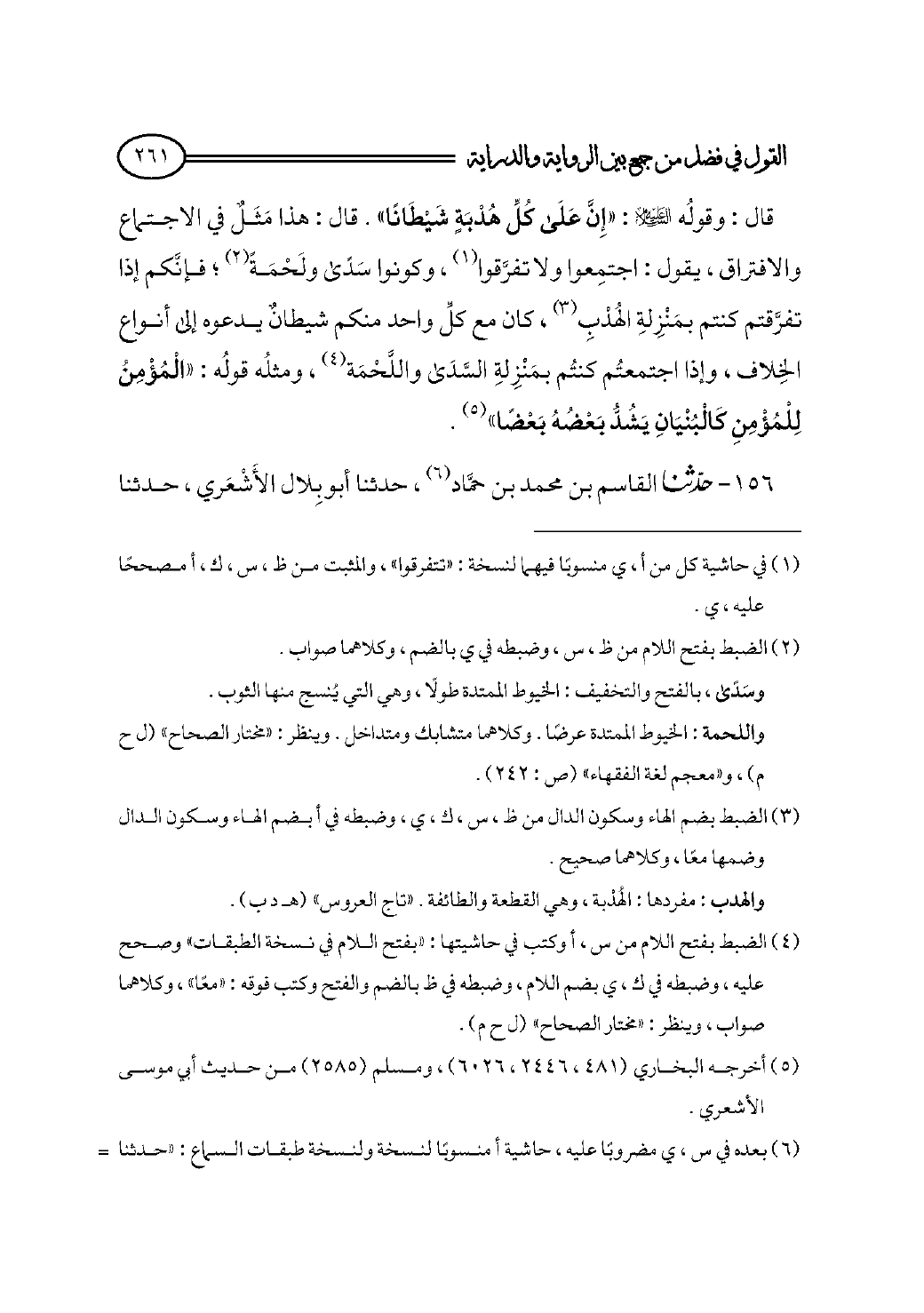 قال: وقولُه - عليه السلام -: «إِنَّ عَلَى كُلِّ هُدْبَةٍ شَيْطَانًا». قال: هذا مَثَلٌ في الاجتماع والافتراق، يقول: اجتمِعوا ولا تفرَّقوا (¬١)، وكونوا سَدًى ولَحْمَةً (¬٢)؛ فإنَّكم إذا تفرَّقتم كنتم بمَنْزِلةِ الهُدْبِ (¬٣)، كان مع كلِّ واحد منكم شيطانٌ يدعوه إلى أنواع الخِلاف، وإذا اجتمعتُم كنتُم بمَنْزِلةِ السَّدَى واللَّحْمَة (¬٤)، ومثلُه قولُه: «الْمُؤْمِنُ لِلْمُؤْمِنِ كَالْبُنْيَانِ يَشُدُّ بَعْضُهُ بَعْضًا» (¬٥).