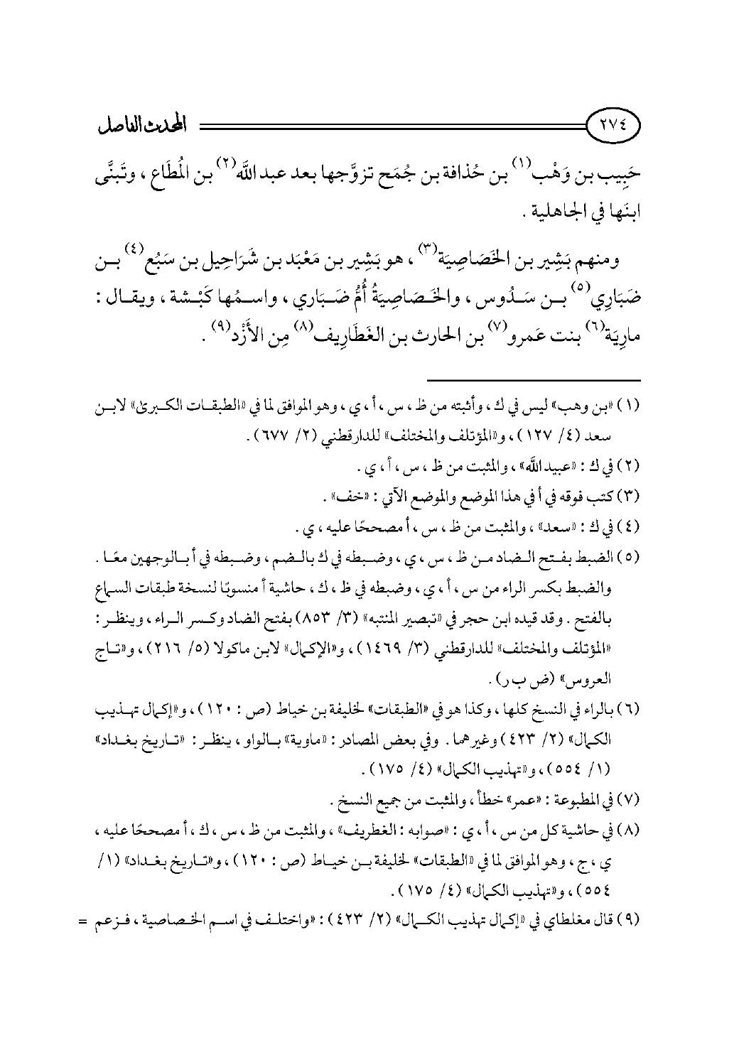 (¬٩) قال مغلطاي في «إكمال تهذيب الكمال» (٢/ ٤٢٣): «واختلف في اسم الخصاصية، فزعم الرامهرمزي: أنها كبشة، ويقال: مارية بنت عمرو بن الحارث بن الغطريف الأصغر. والذي في كتب النسابين: بنت إلاءة بن عمرو بن كعب بن الغطريف. والله أعلم».