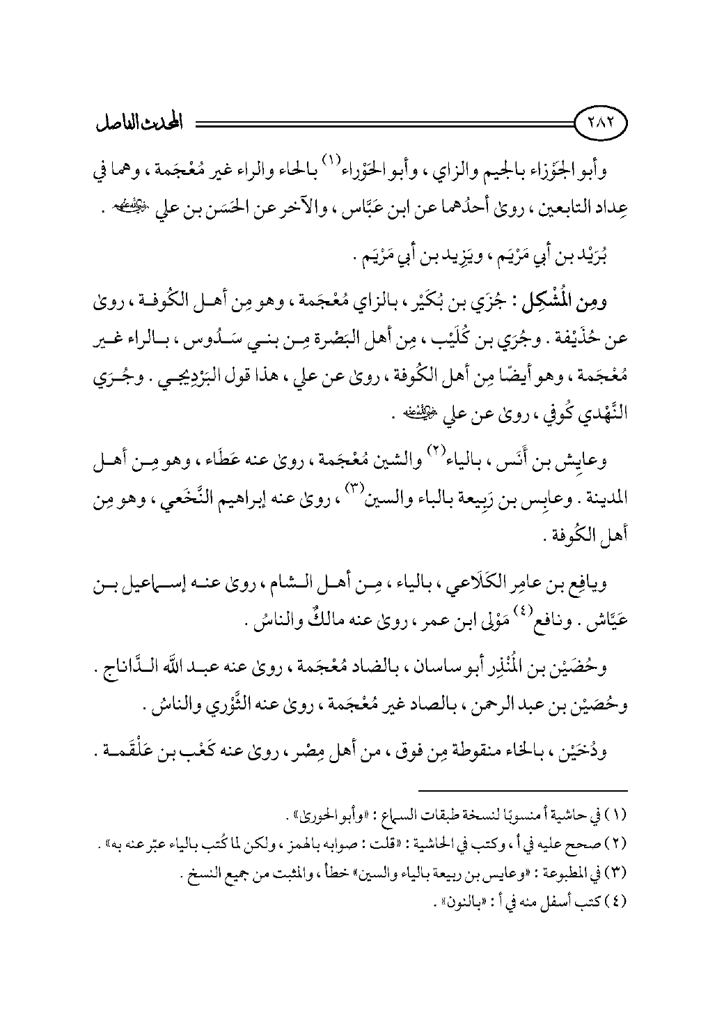 ومِن المُشْكِل: جُزَي بن بُكَيْر، بالزاي مُعْجَمة، وهو مِن أهل الكُوفة، روى عن حُذَيْفة. وجُرَي بن كُلَيْب، مِن أهل البَصْرة مِن بني سَدُوس، بالراء غير مُعْجَمة، وهو أيضًا مِن أهل الكُوفة، روى عن علي، هذا قول البَرْدِيجي. وجُرَي النَّهْدي كُوفي، روى عن علي - رضي الله عنه -.