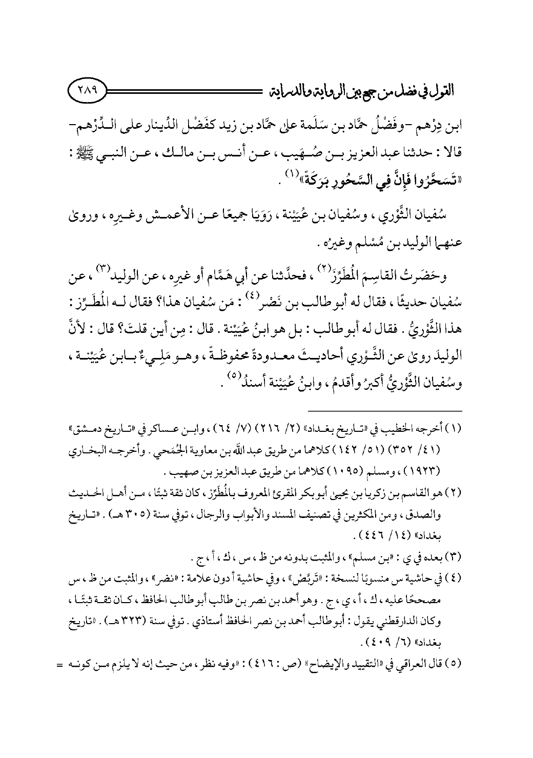 (¬٥) قال العراقي في «التقييد والإيضاح» (ص: ٤١٦): «وفيه نظر، من حيث إنه لا يلزم من كونه مليئًا بابن عيينة -على تقدير تسليمه- أن يكون هذا من حديثه عنه إذا أطلقه، بل يجوز أن يكون هذا من تلك الأحاديث المعدودة التى رواها الوليد عن سفيان الثوري.