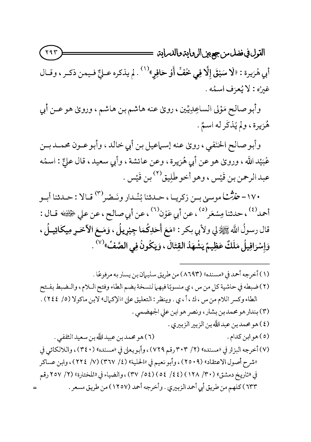 ١٧٠ - حدثنا موسى بن زكريا، حدثنا بُنْدار ونَصْر (¬٣) قالا: حدثنا أبو أحمد (¬٤)، حدثنا مِسْعَر (¬٥)، عن أبي عَوْن (¬٦)، عن أبي صالح، عن علي - رضي الله عنه - قال: قال رسولُ الله - صلى الله عليه وسلم - لي ولأبي بكر: «مَعَ أَحَدِكُمَا جِبْرِيلُ، وَمَعَ الآخَرِ مِيكَائِيلُ، وَإِسْرَافِيلُ مَلَكٌ عَظِيمٌ يَشْهَدُ القِتَالَ، وَيَكُونُ فِي الصَّفِّ» (¬٧).